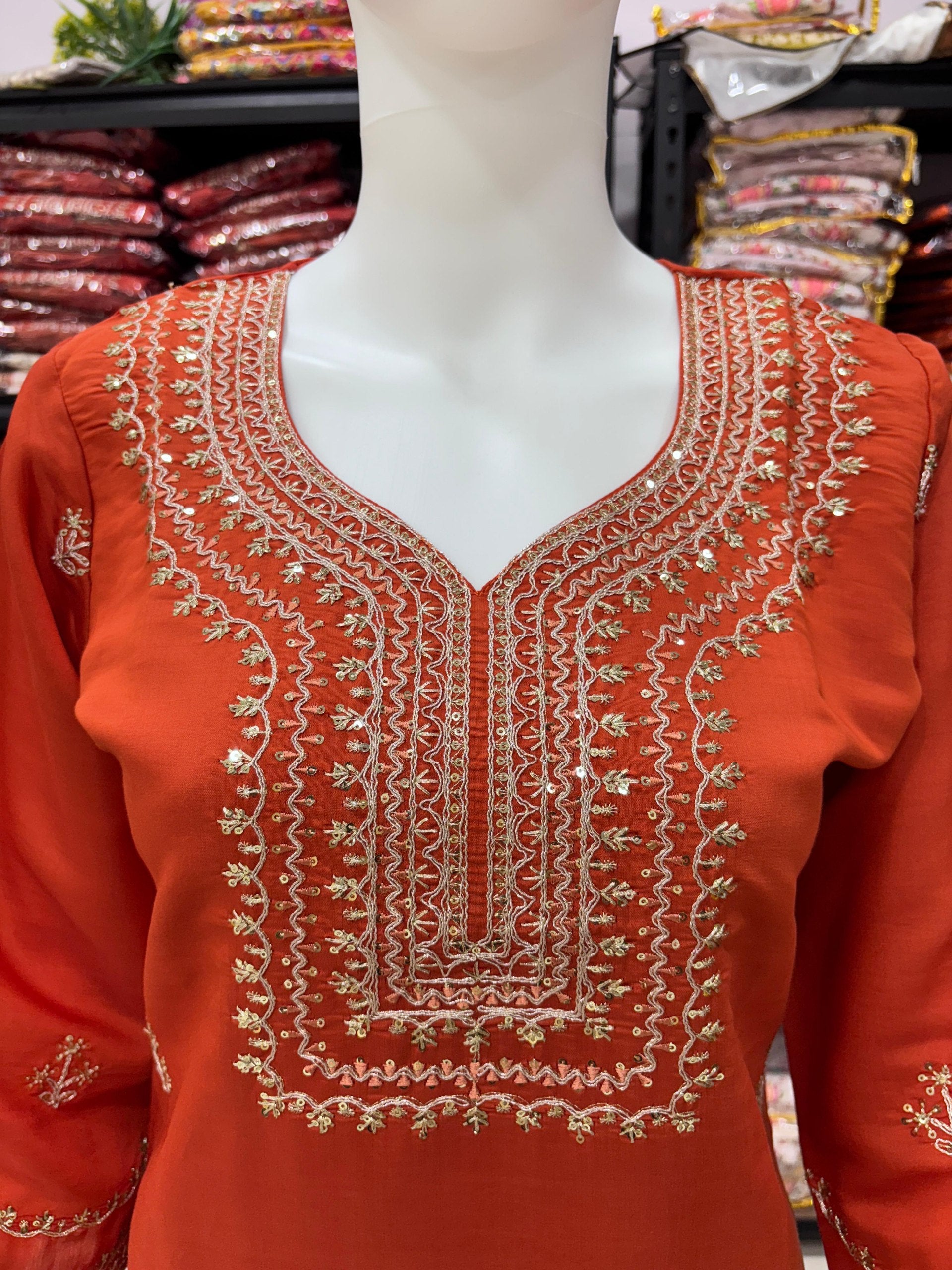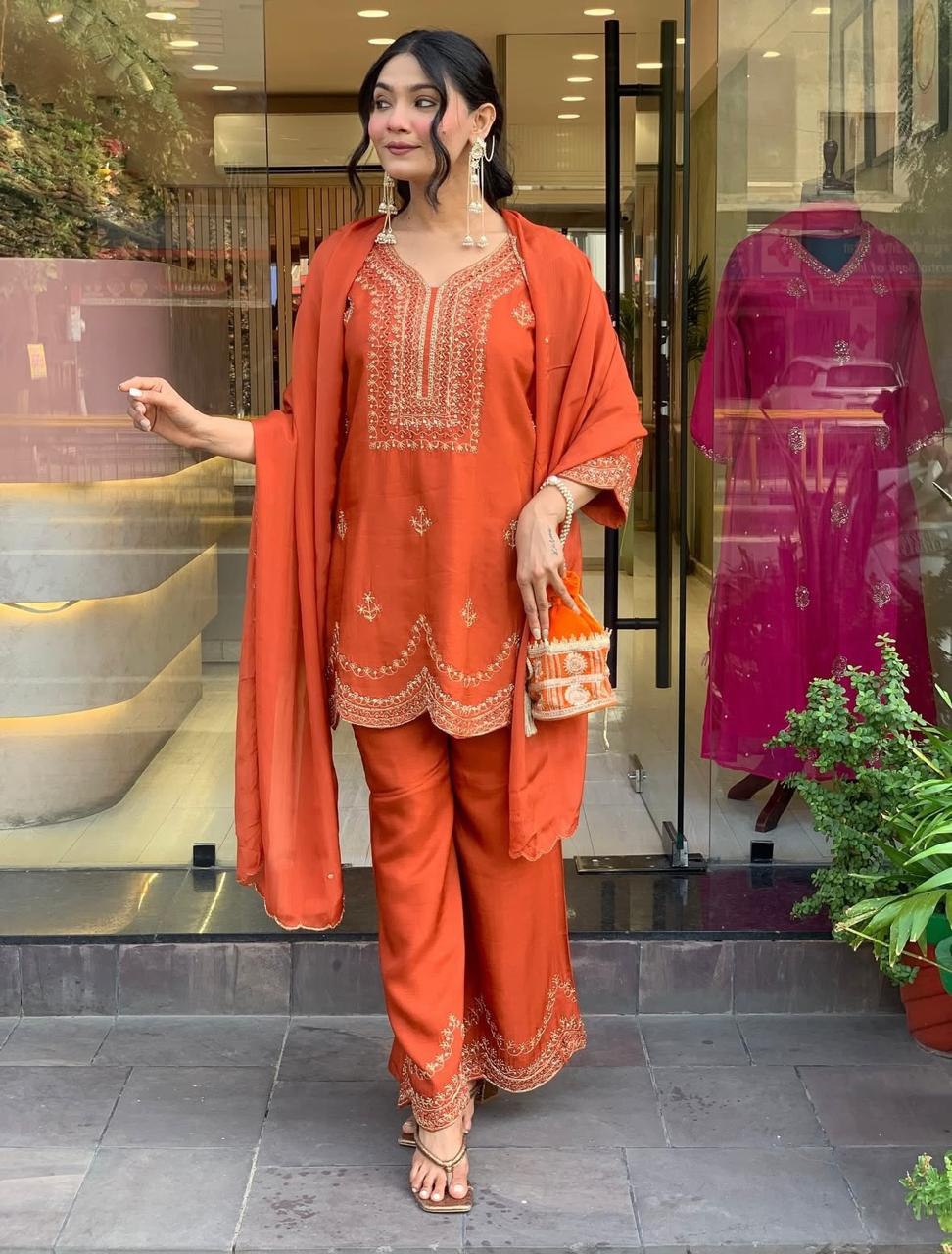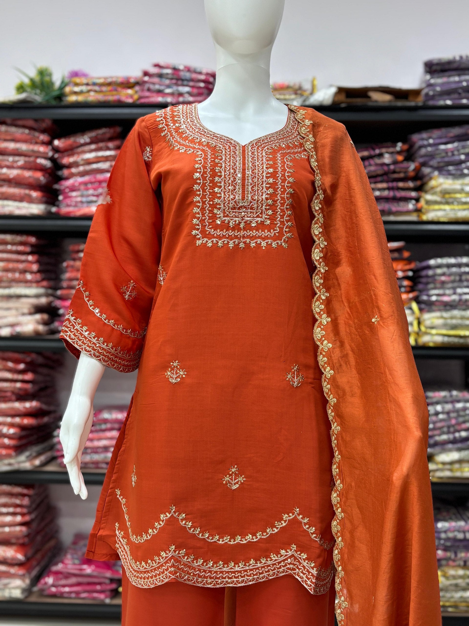 Step into elegance and festive charm with the O9952 Premium 3-Piece Plazo Set, crafted from 100% pure Roman silk for the kurti and pant, paired with a Chanderi dupatta featuring multi embroidery and a delicate cut work border. Perfect for Navratri, weddings, festivals, or social gatherings, this set is designed to make you the center of attention.