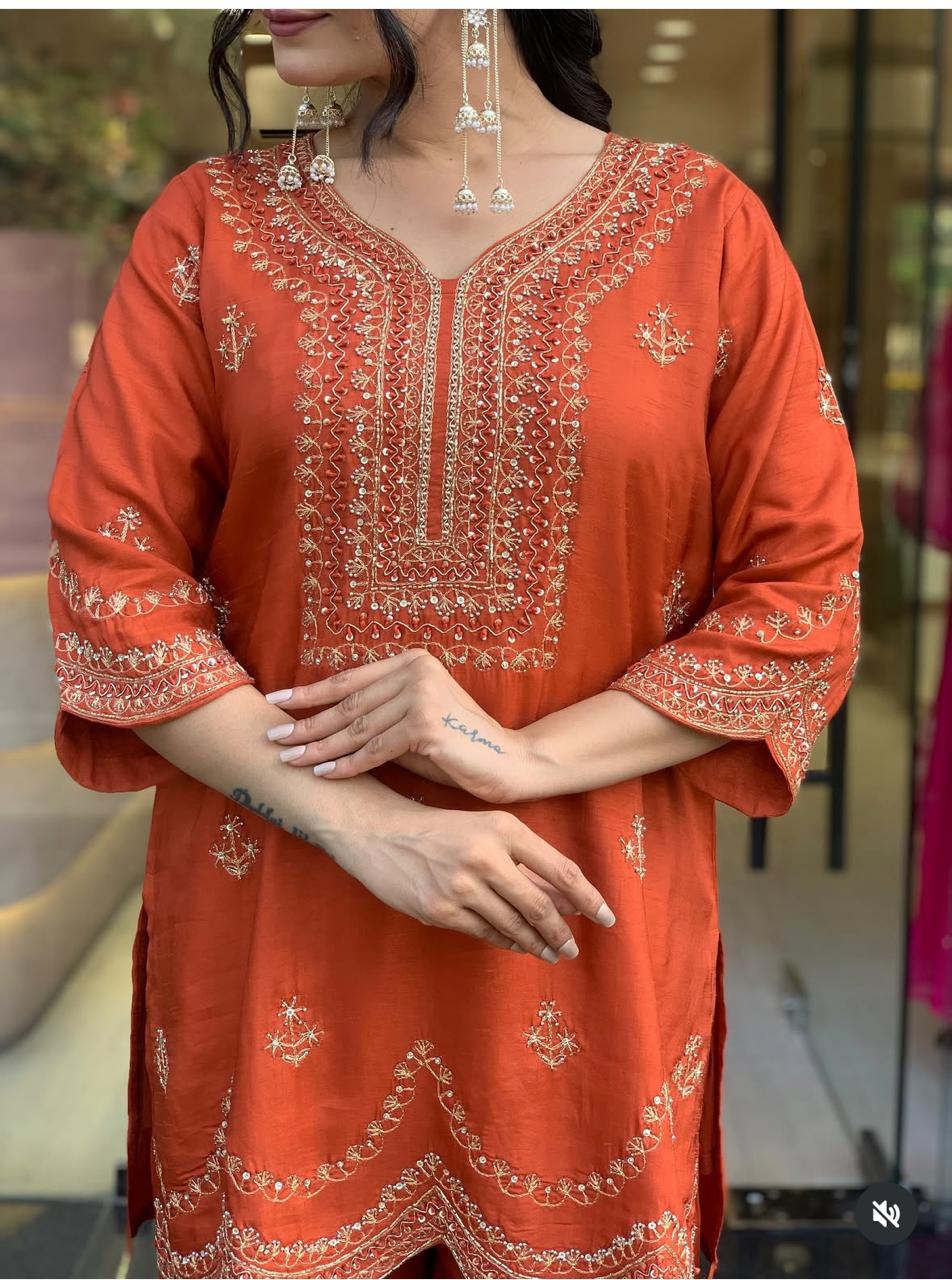 The Roman silk fabric is luxurious, breathable, and shines elegantly, ensuring comfort while keeping you stylish. The kurti and pant feature ultra-fine sequence and coding machine work, finished to showroom standards for a polished, high-quality look.