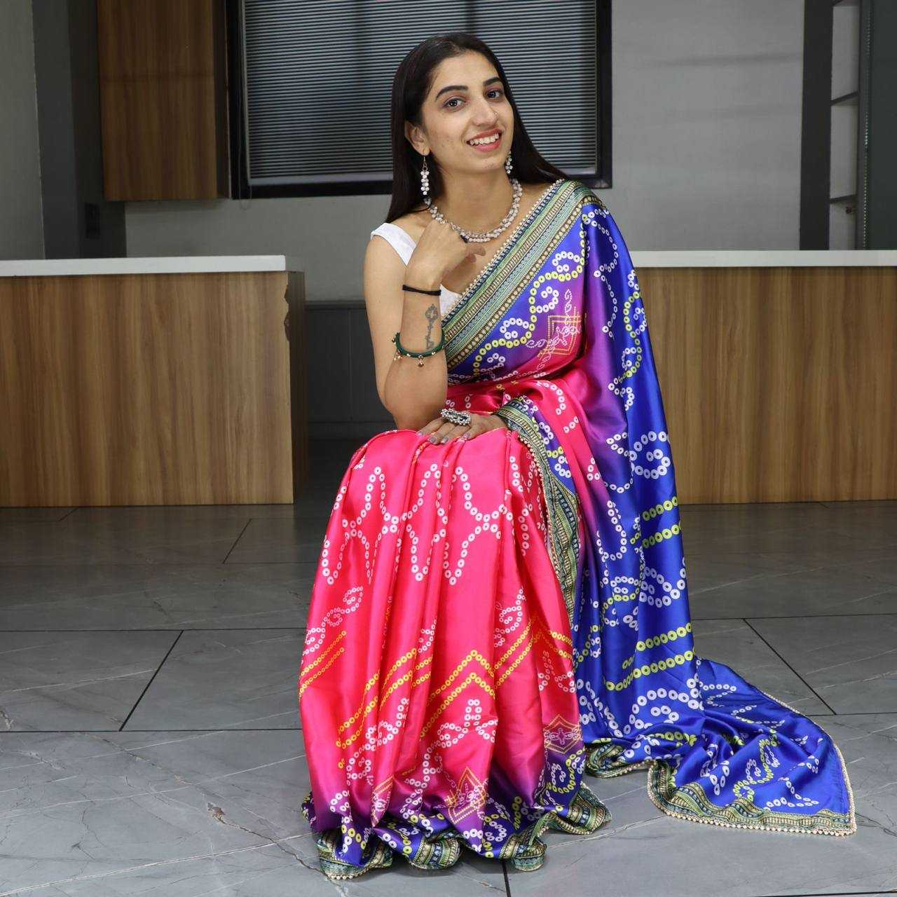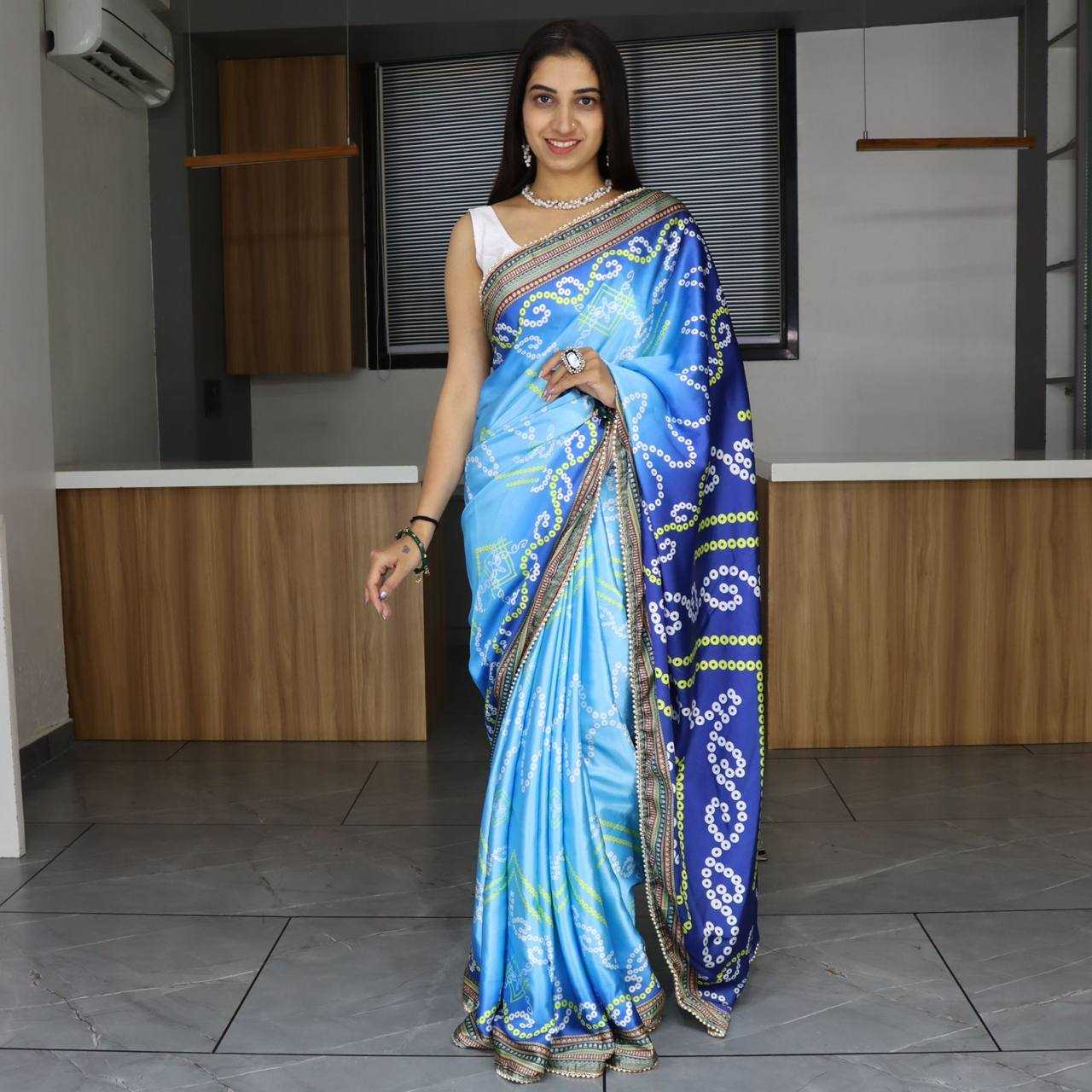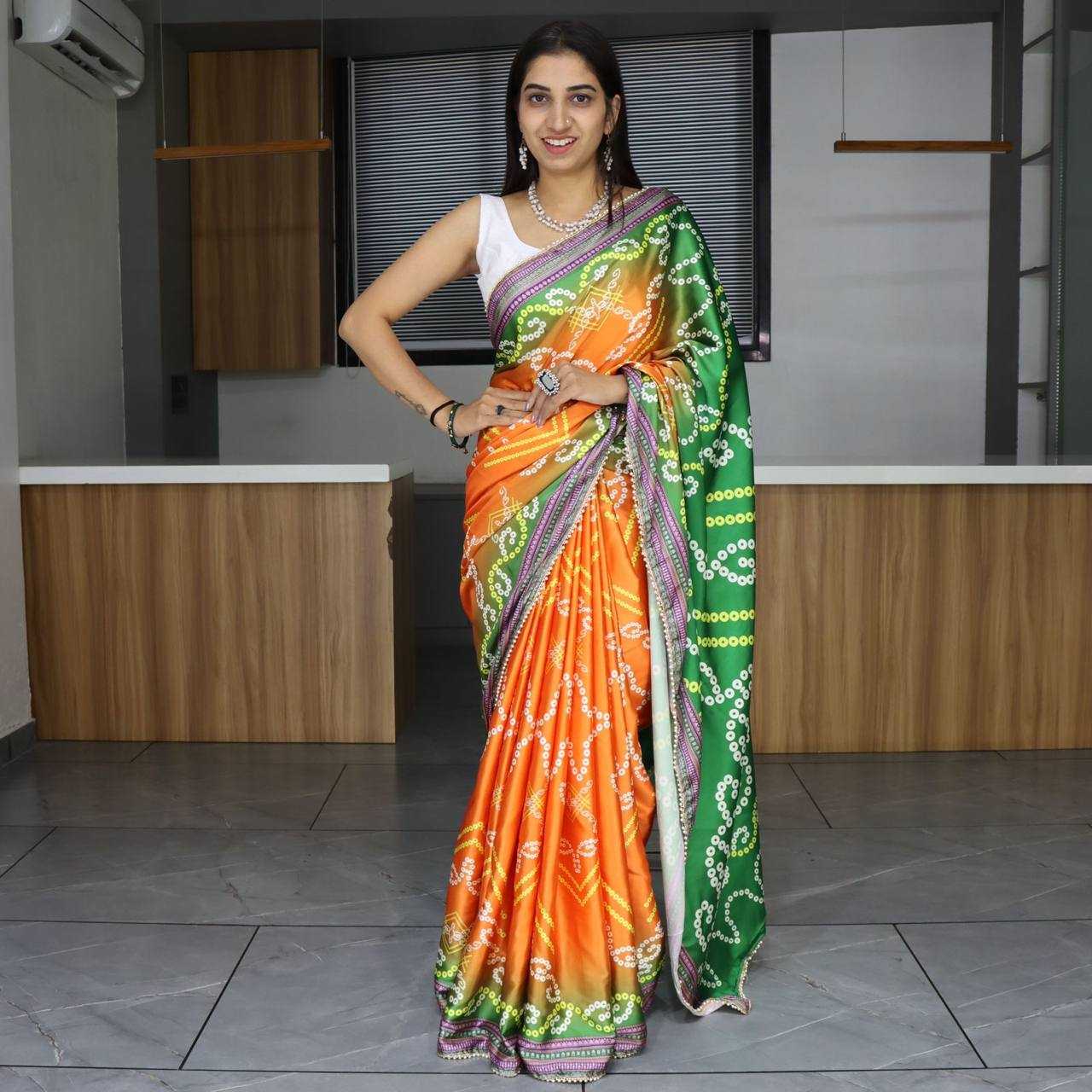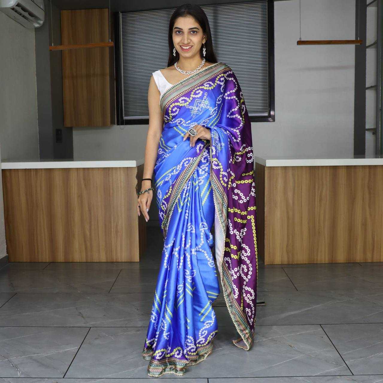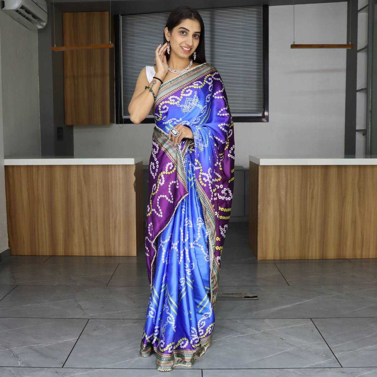 Fabric: Heavy Japan SatinWork: Bandhani printed with Moti lace and Pearl laceLength: 5.5 metersWeight: 0.680 kgBlouse (Unstitched)