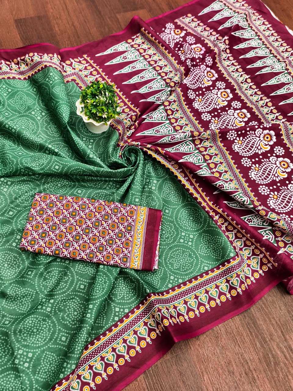 Fabric: Pure Mulmul Cotton Saree: 5.50 Mtr Approx Pure Mulmul Cotton with Bandhani Print Blouse: 0.80 Mtr Approx Running Pure Cotton (Same as Photo)