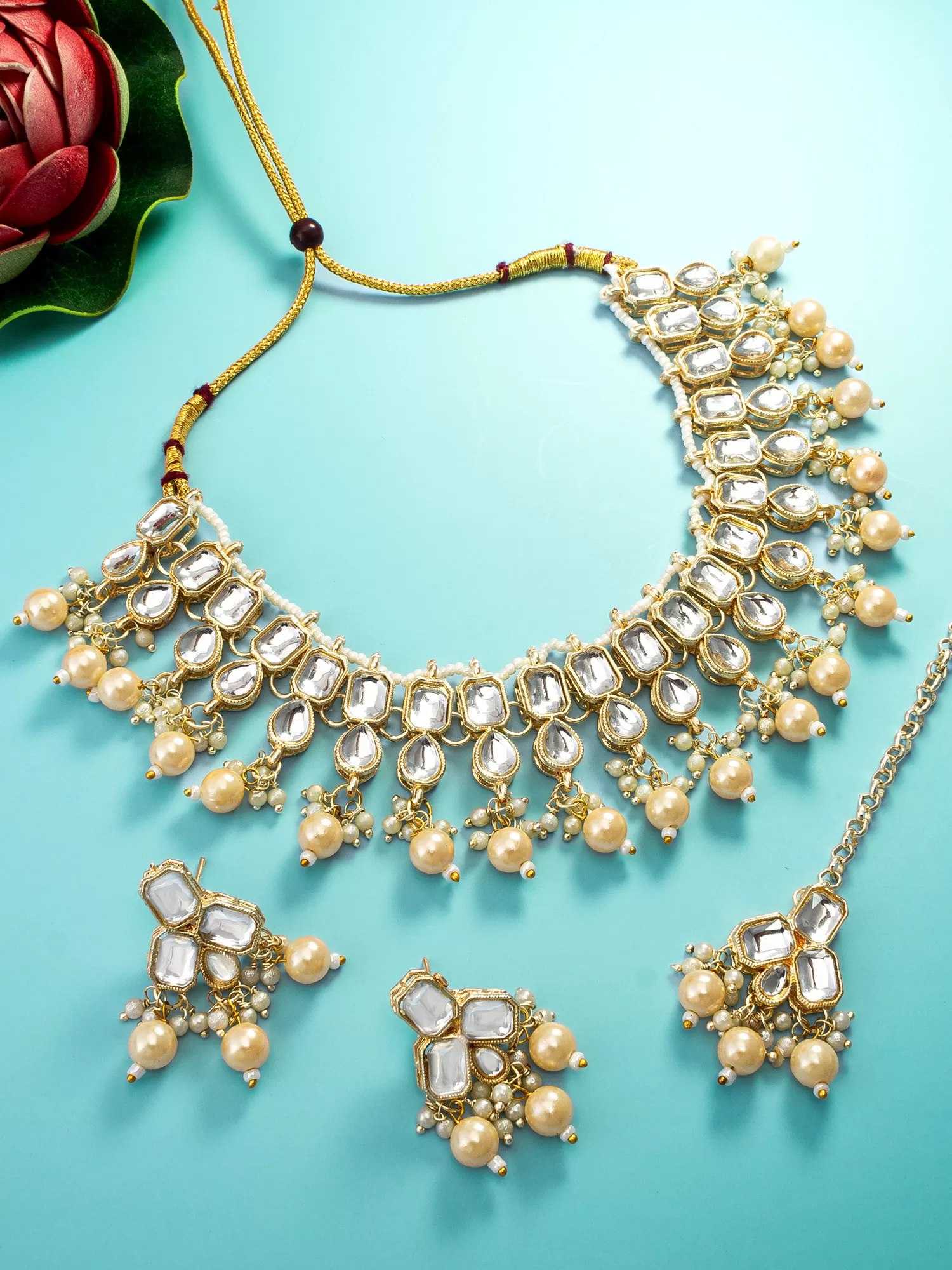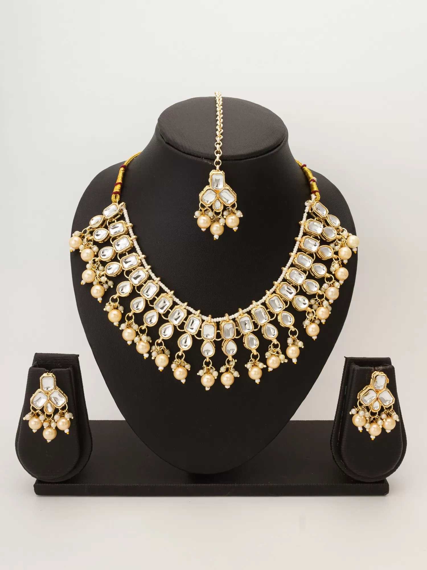 This elegant gold necklace and earrings set is adorned with lustrous pearls, adding a touch of sophistication to any outfit. The timeless design and high-quality craftsmanship make it a perfect choice for special occasions or everyday wear. The set comes in a beautiful presentation box, making it an ideal gift for a loved one or a luxurious treat for yourself.