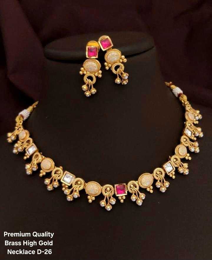 Premium quality brass high gold necklace set crafted with intricate detailing and matte finish for a luxurious appeal. The necklace is adorned with designer motifs, highlighted by elegant pearl drops and vibrant stone accents in white and ruby tones. Paired with matching earrings, this set perfectly blends tradition with sophistication, making it ideal for weddings, festive occasions, or gifting. Durable, stylish, and versatile, it adds timeless charm to any outfit.