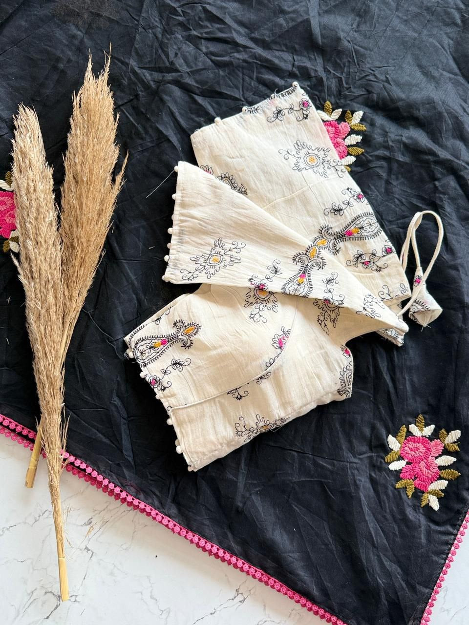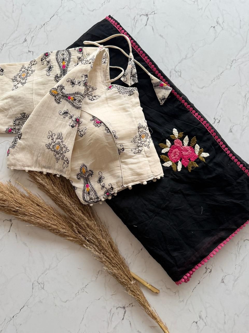 • Blouse Fabric: Pure Khadi cotton with multi-thread embroidery, fully stitched up to size 42