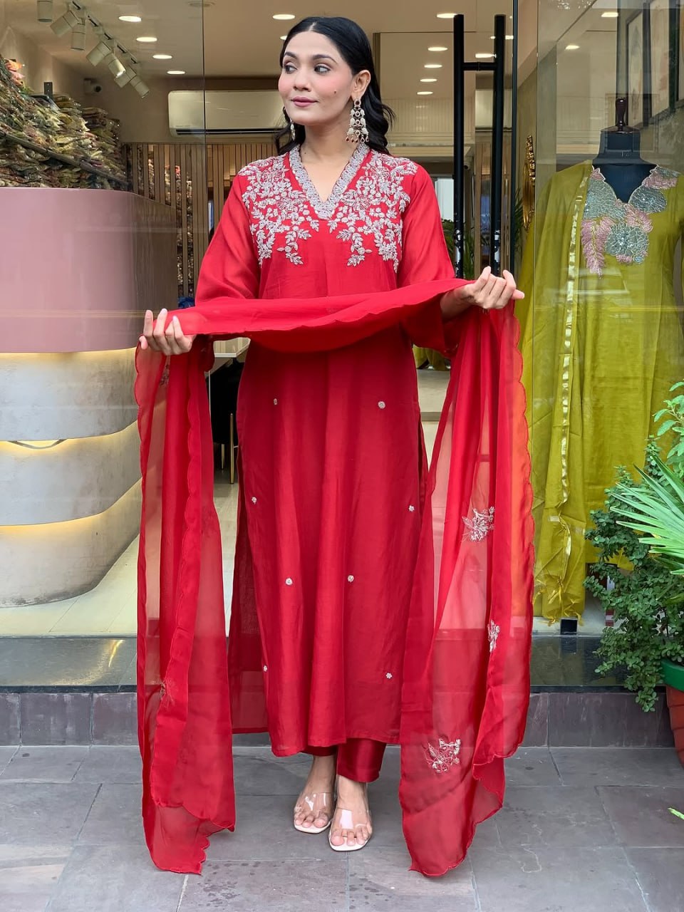 Classic and elegant, this Chanderi Kurta Set features embroidered kurti, matching pants, and Chanderi dupatta with embroidery. Perfect for weddings, parties, and festive occasions.