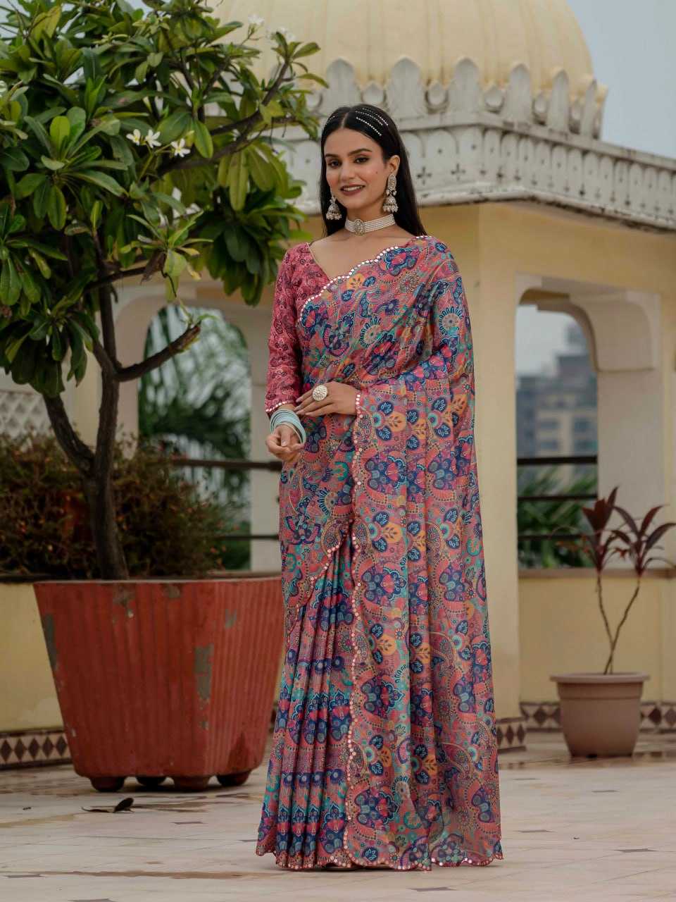 Fabric :- heavy Chinnon Pattern :- Print Work with Beautiful Kutchi Work Mirror Lace BorderBlouse :- heavy Chinnon Saree :- Ready To Wear Blouse Cut :- 0.8 Meter