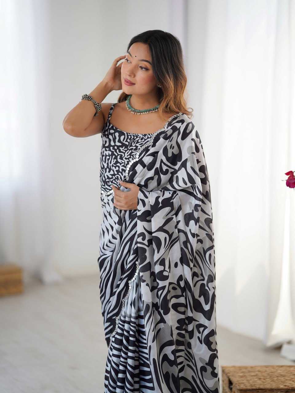 Product Details Fabric :- heavy Chinnon Pattern :- Print Work with Beautiful Kutchi Work Mirror Lace BorderBlouse :- heavy Chinnon Saree Cut :- 5.5 Meter Blouse Cut :- 0.8 Meter