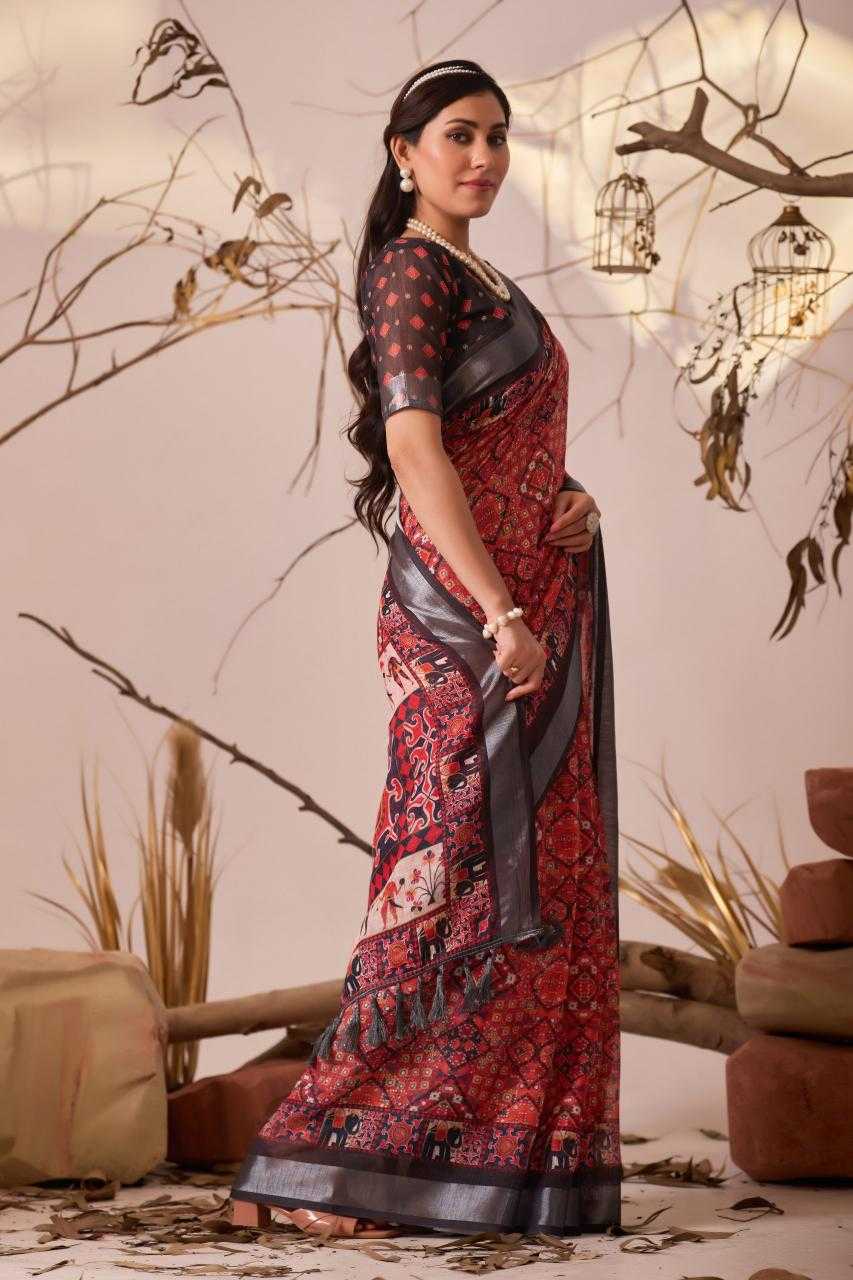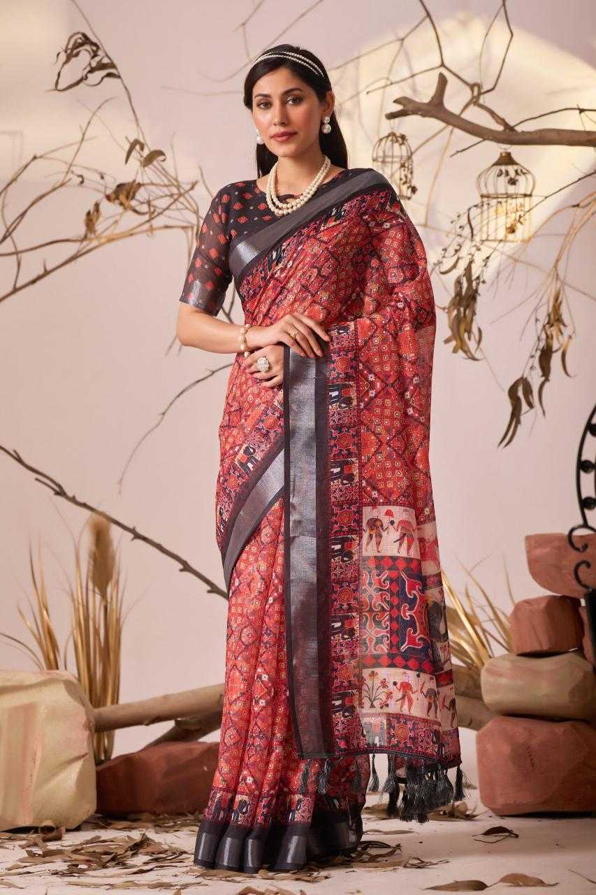 FABRIC: Premium Linen Cotton Saree with Elegant Digital Floral & Royal Ethnic Print & Classic Contrast Patola Style Border (5.5 Mtr Saree)