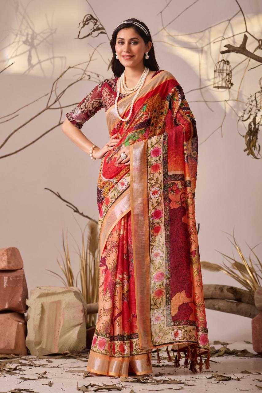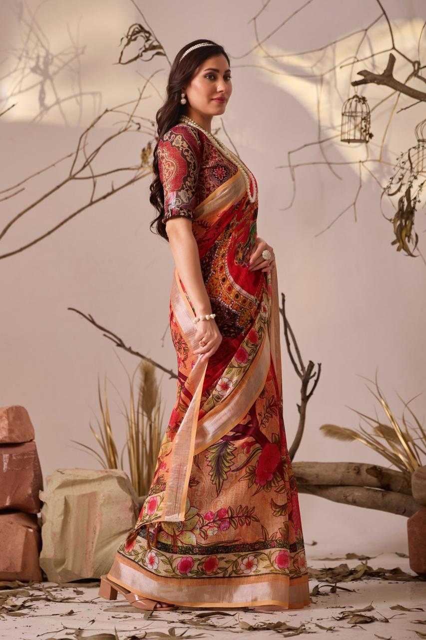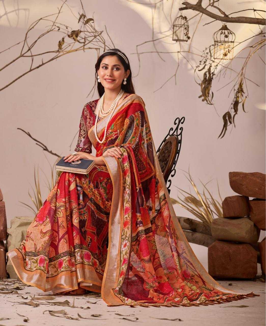 FABRIC: Premium Linen Cotton Saree with Elegant Digital Floral & Artistic Print & Classic Contrast Patola Style Border (5.5 Mtr Saree)