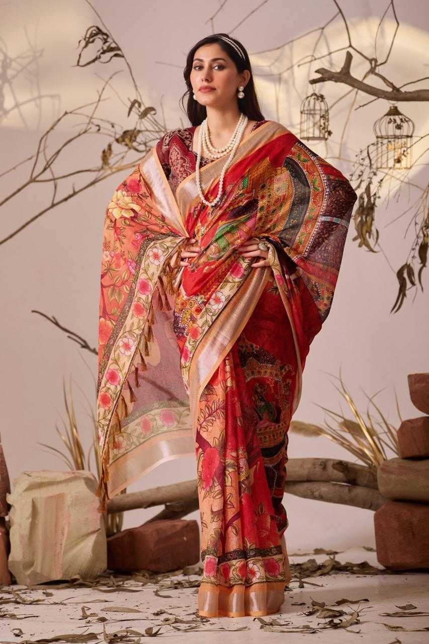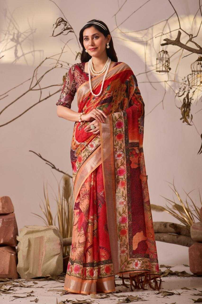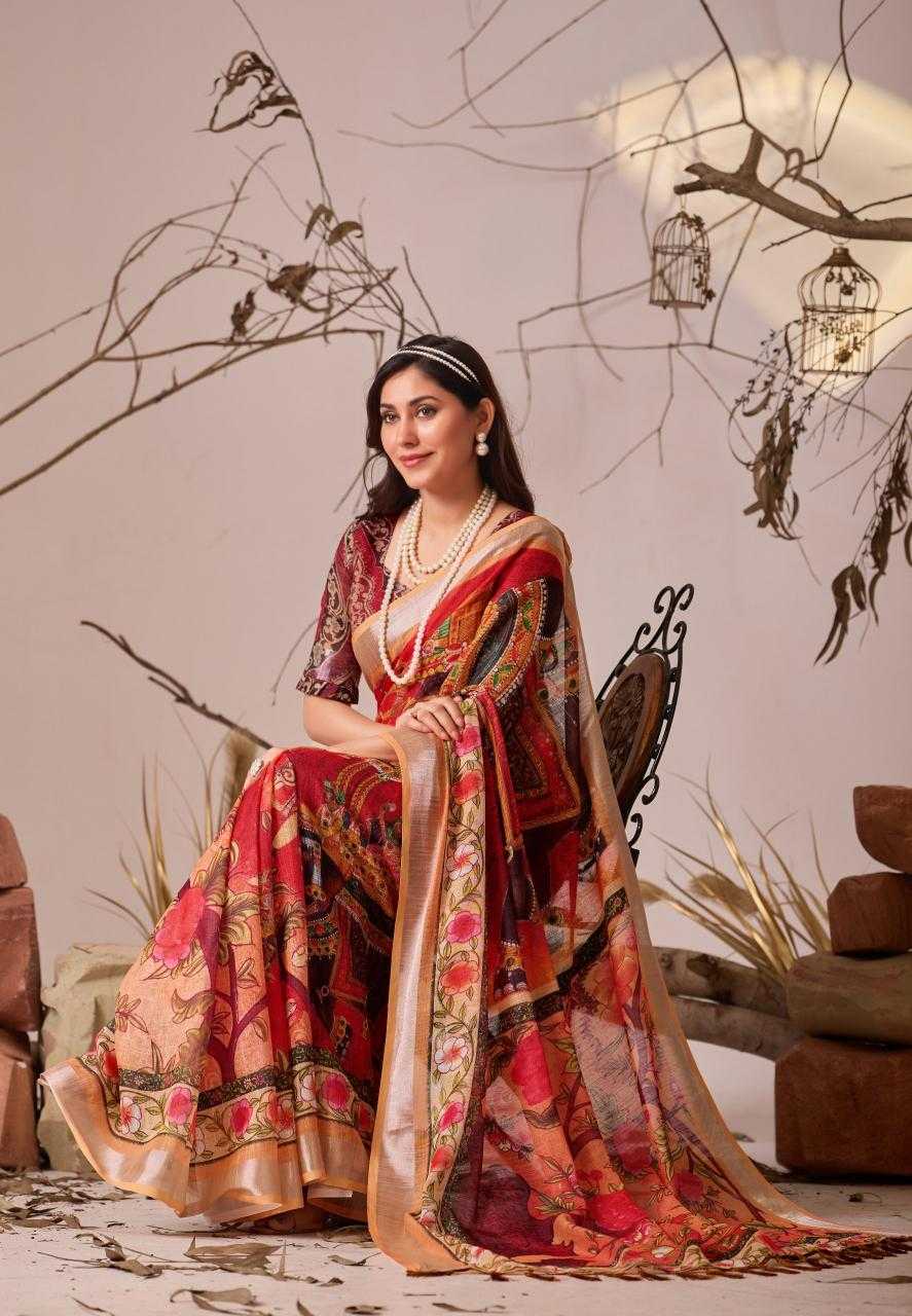 FABRIC: Premium Linen Cotton Saree with Elegant Digital Floral & Artistic Print & Classic Contrast Patola Style Border (5.5 Mtr Saree)