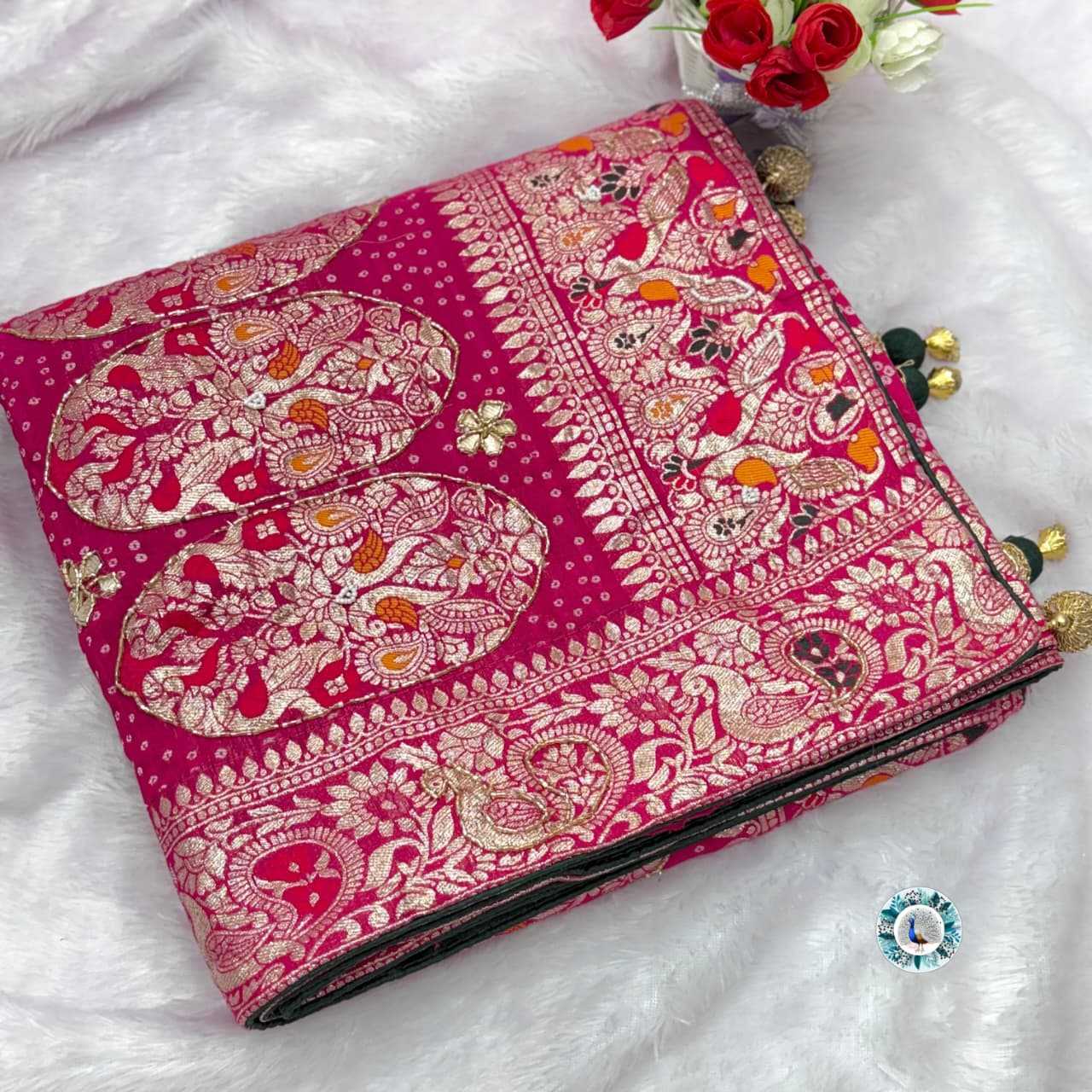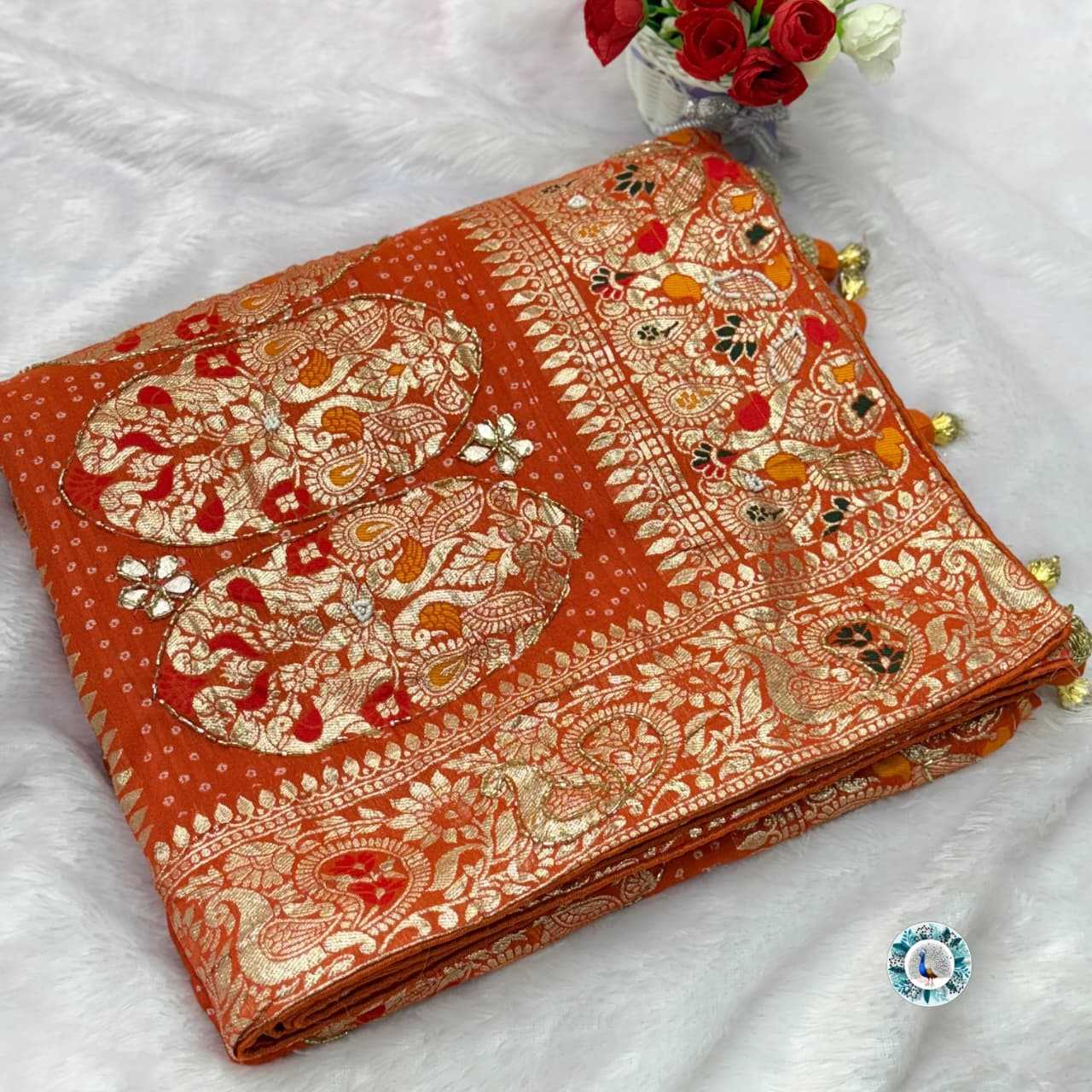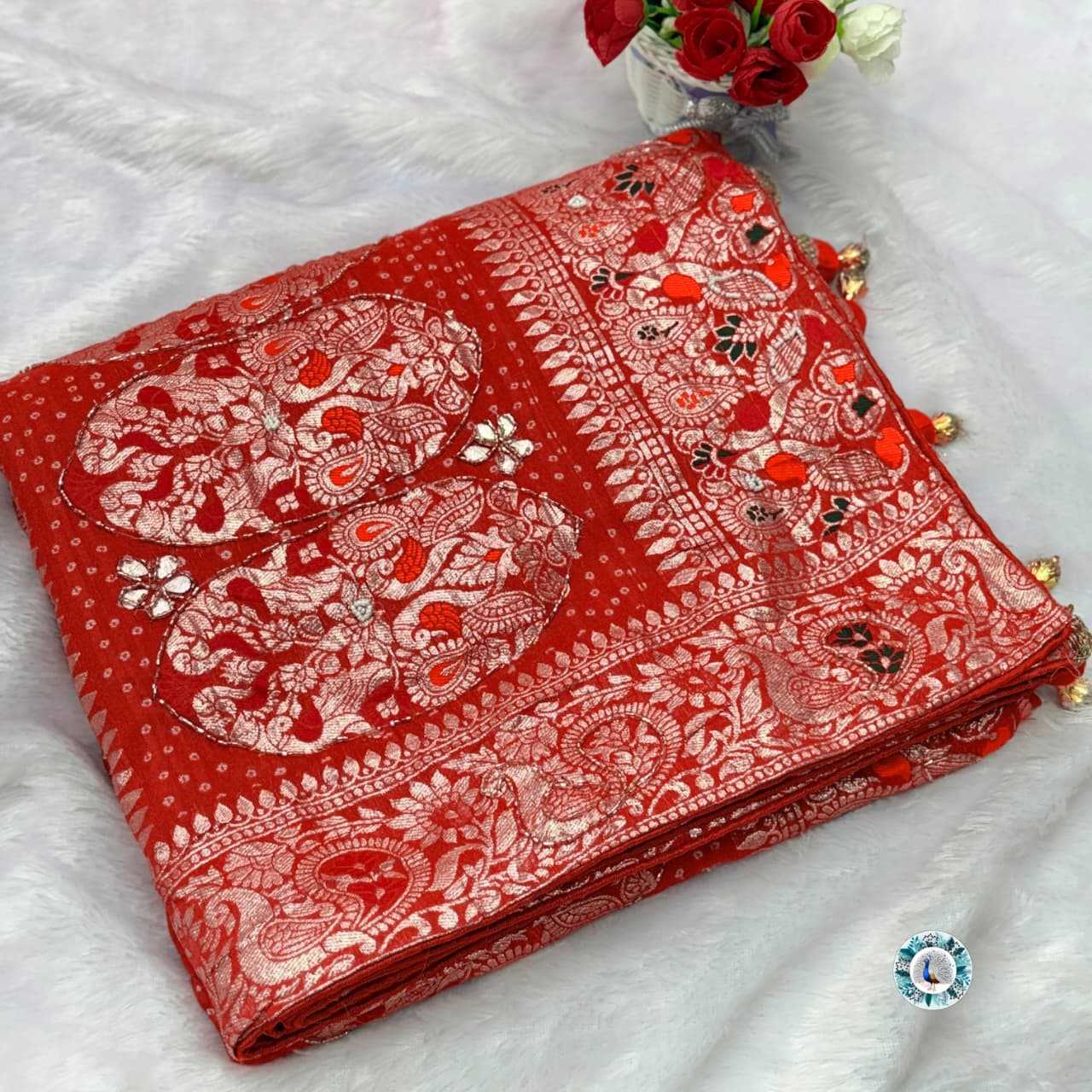 Fabric-soft dola silk best Fabric with beautiful weaving zari design and heavy looking handwork of moti+pipin best finished with gota work in buti and heavy looking tassels in pallu borderWith Attractive Contrast zari work blouse