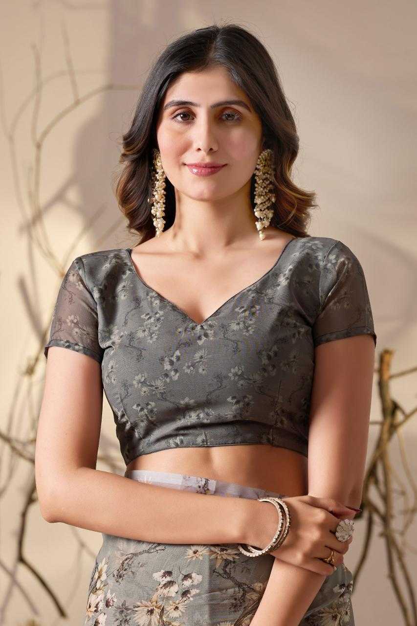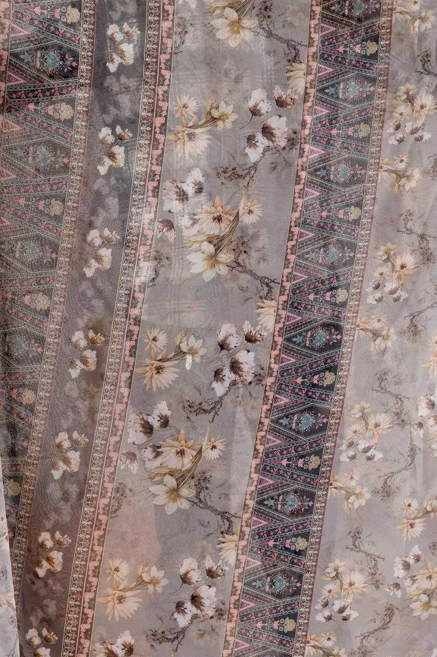 FABRIC: Soft Georgette Saree in Muted Grey Base Adorned with All-Over Floral Digital Print and Enhanced with Ornate Tribal-Style Patterned Pallu Featuring Pink, Black & Teal Accents + Elegant Black Tassel Detailing (5.5 Mtr Saree)