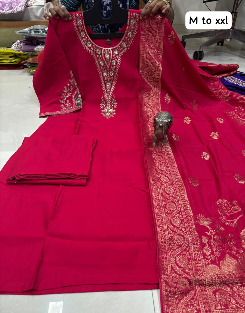 Fabric: Heavy Soft MaslinWork: Premium Hand Work on Kurti + Hand DetailingSet Includes: Kurti + Pant + Unique Banarasi DupattaSizes: M, L, XL, XXL (Size mentioned on photo)