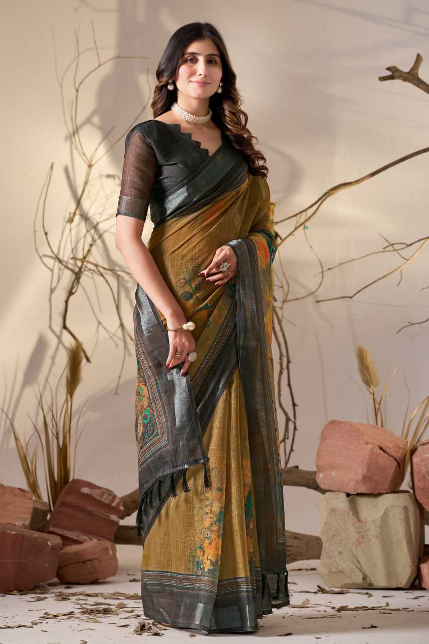 Drape yourself in timeless elegance with this stunning linen cotton saree that perfectly blends modern artistry with traditional charm. Featuring a captivating digital floral print that dances across the fabric, this 5.5-meter beauty is finished with an exquisite Patola-inspired border that whispers sophistication. The premium linen-cotton blend ensures breathable comfort while maintaining that coveted graceful drape. Paired with a matching contrast printed blouse (0.80 mtr), you're all set to turn heads at weddings, festivals, or special occasions. A versatile wardrobe essential that celebrates your unique style!
