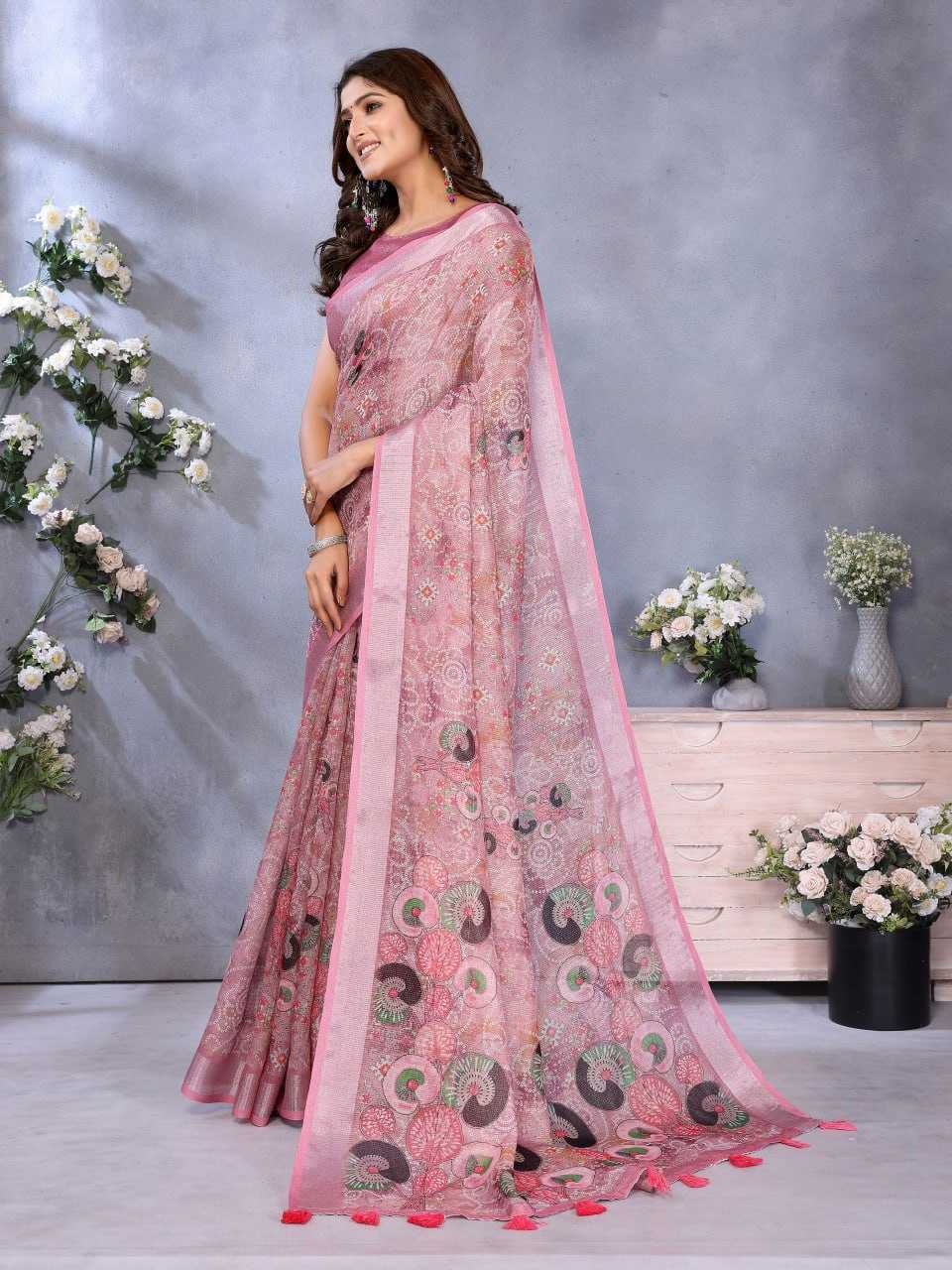 This rose pink saree blends ethnic motifs with a modern charm, featuring intricate circular and floral-inspired prints across its body. The soft shimmer fabric, complemented by a matching plain border and tassel detailing, adds a graceful touch. Light in weight yet rich in appearance, this saree is perfect for festive and traditional gatherings.