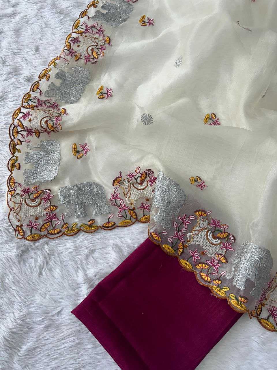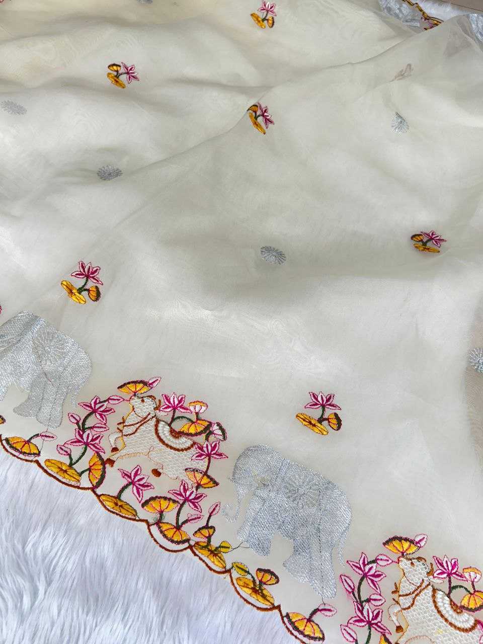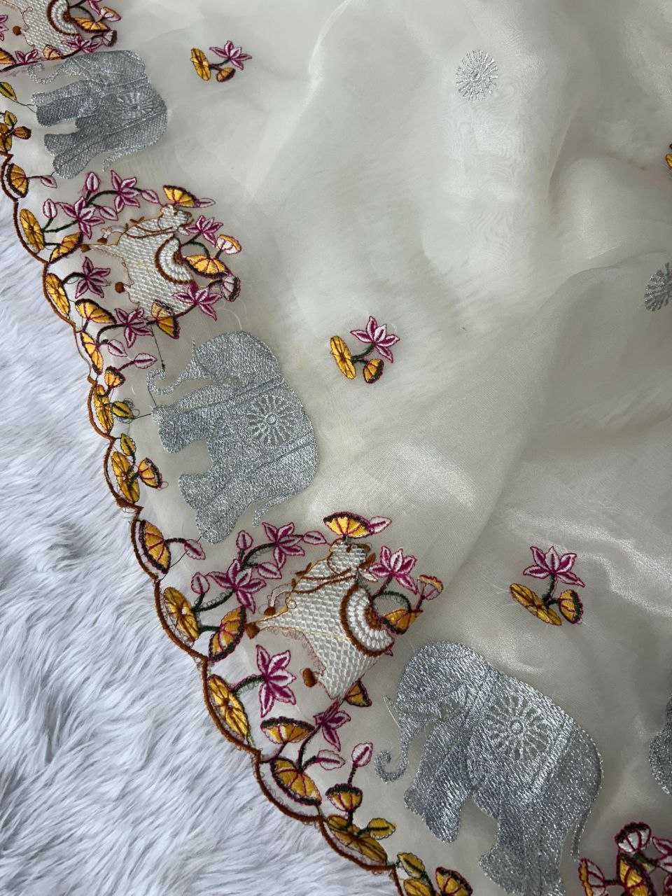 Work*: Beautiful floral and animal designer work border of Malti color thread and zari lace embroidery work with Cutwork