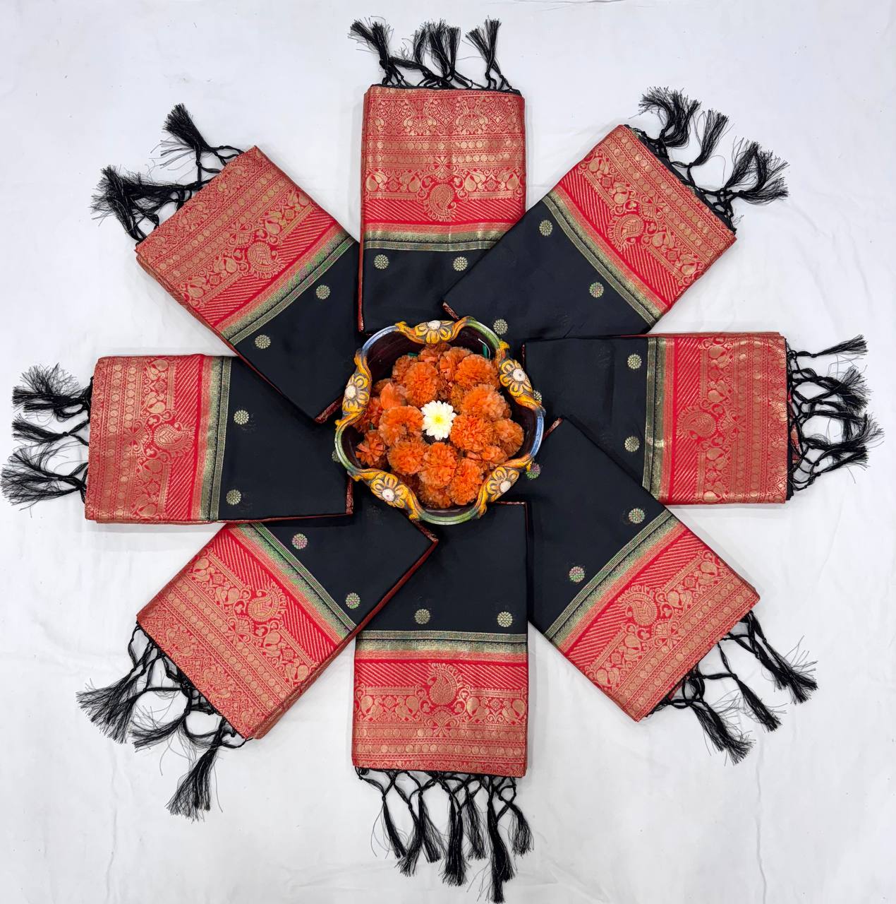 Work: Beautiful weaving with golden zari all over, featuring a heavy pallu and rich zari-embroidered border
