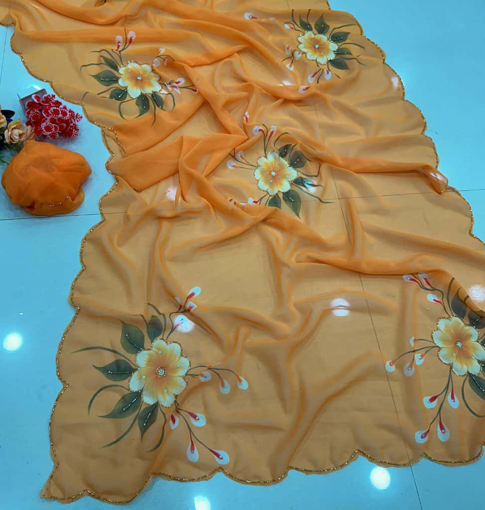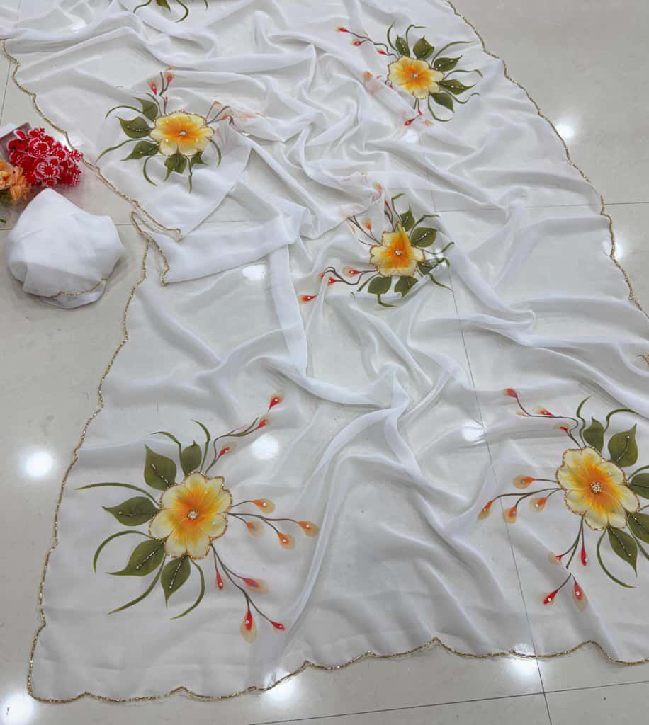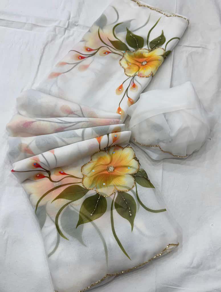 A premium designer saree crafted from Pure Soft Georgette Silk, featuring beautiful digital floral prints that add a refreshing and luxurious touch. Enhanced with hand cutdana detailing and a heavy outing border that runs across the entire saree, this piece is perfect for festive events, parties, and special occasions. Paired with a stylish matching blouse to complete the look.