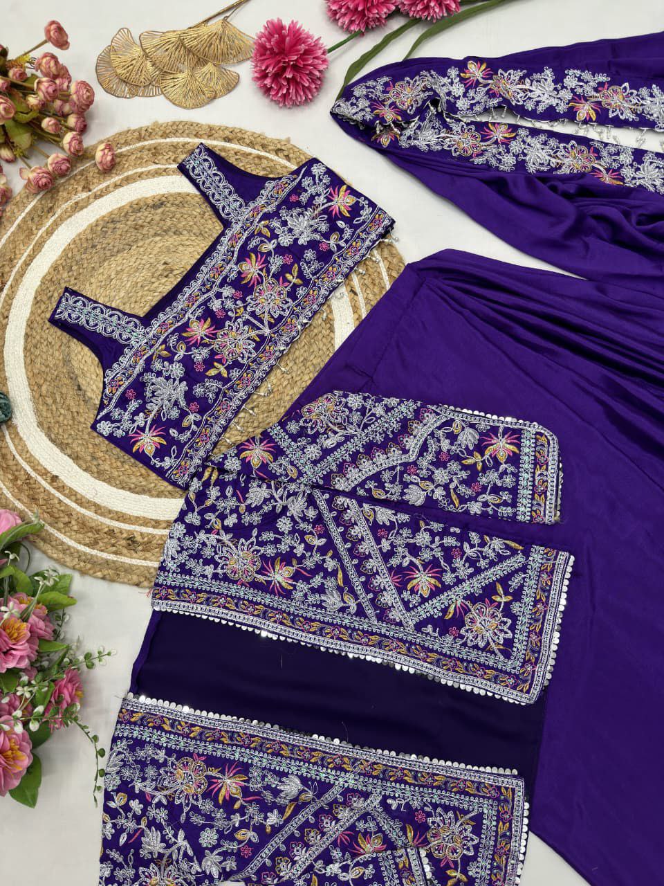 Paired with a full-stitched Mono Banglory Silk blouse and a matching full-stitched jacket/koti in Mono Banglory Silk with multi-thread embroidery & sequins, this set ensures a complete designer look right out of the box.