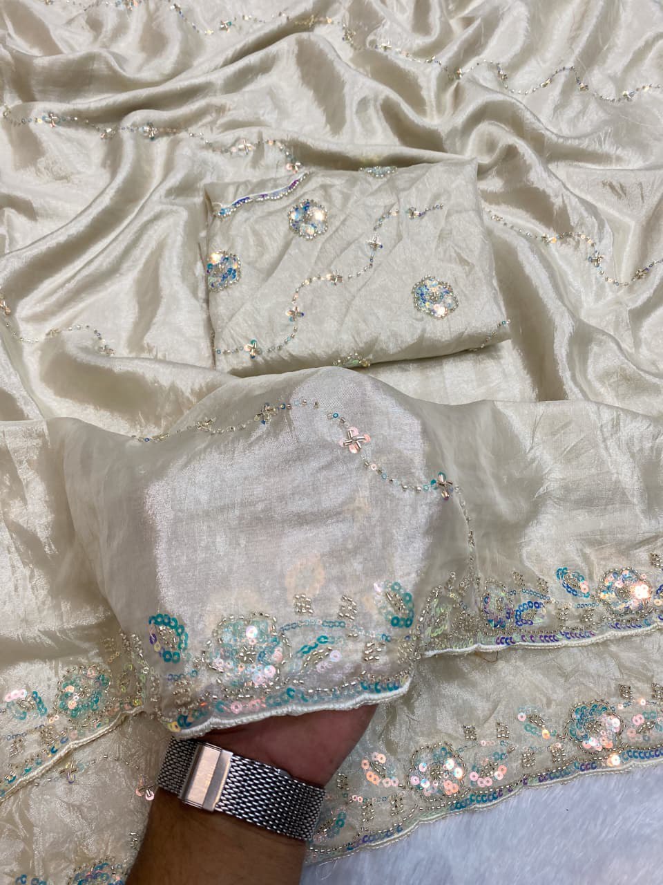 The saree is adorned with original beads handwork, featuring today’s most trending design patterns — ideal for weddings, receptions, sangeet nights, and special celebrations.