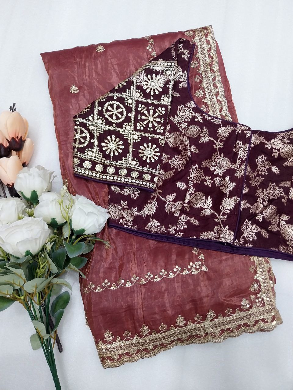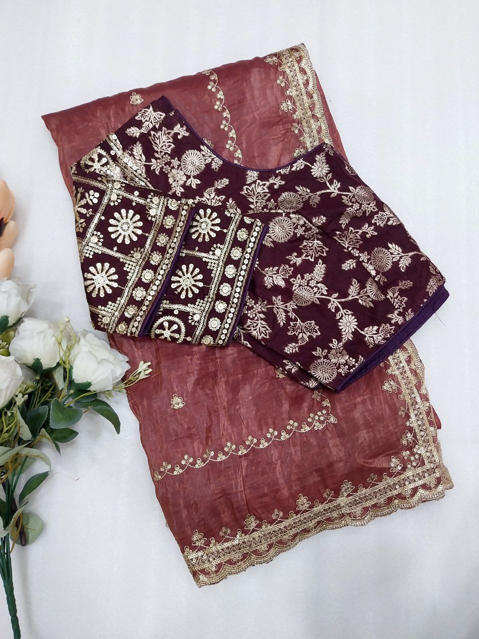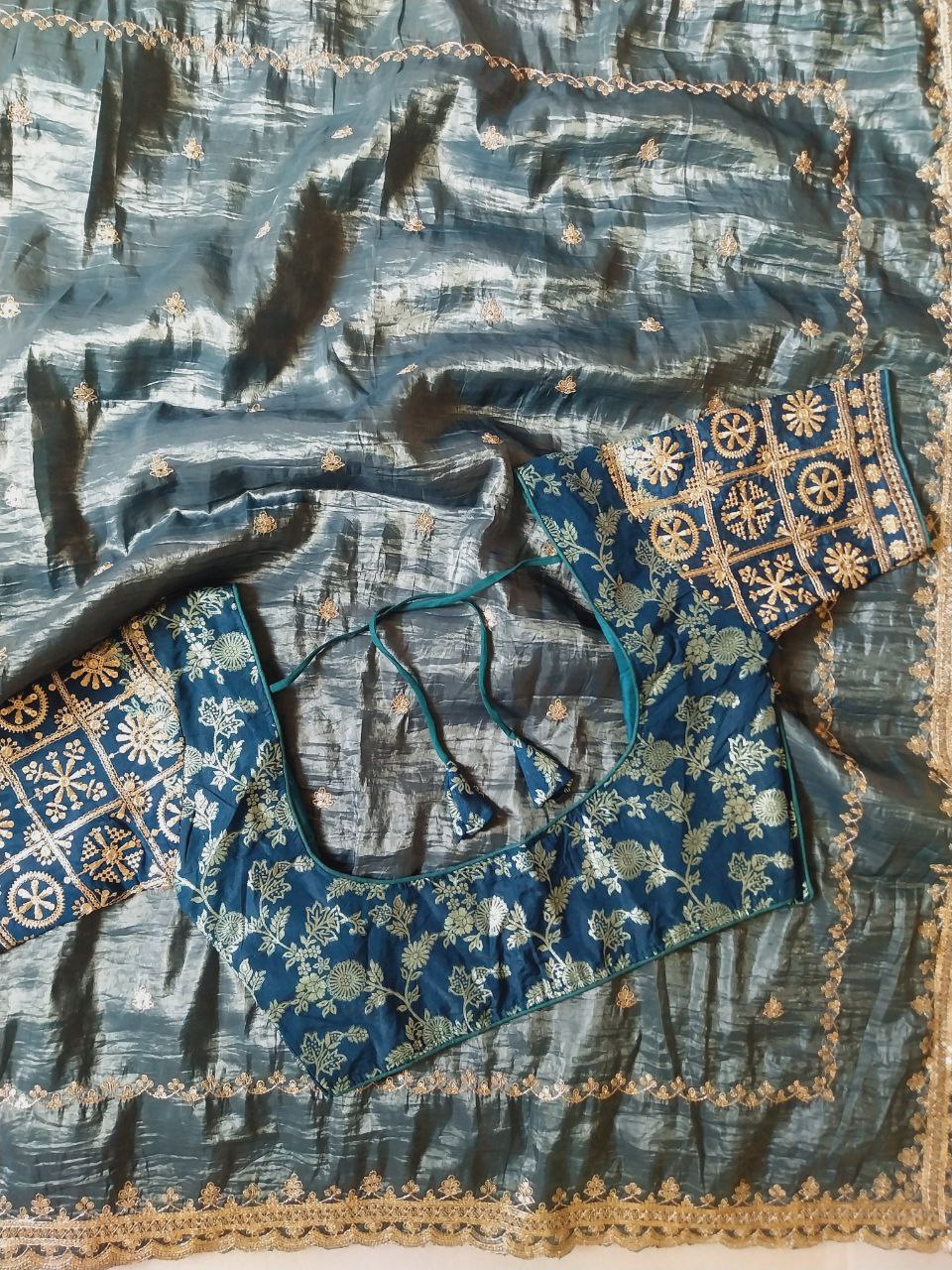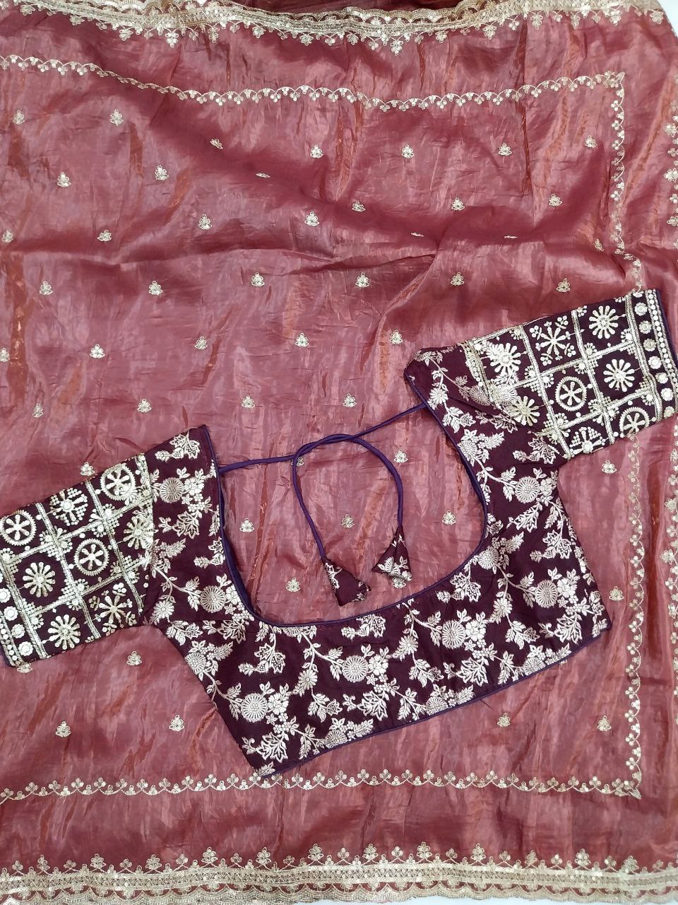 Elevate your ethnic wardrobe with this stunning Tissue Saree that's pure magic! Adorned with intricate embroidery and shimmering sequins scattered across the entire drape, this beauty features an exquisite Aarco border that steals the show. The lightweight tissue fabric ensures effortless grace and comfort, while the coordinating Jacquard Silk blouse—embellished with matching embroidery work—completes your look with sophistication. Perfect for celebrations, festivals, or whenever you want to turn heads and feel absolutely fabulous!