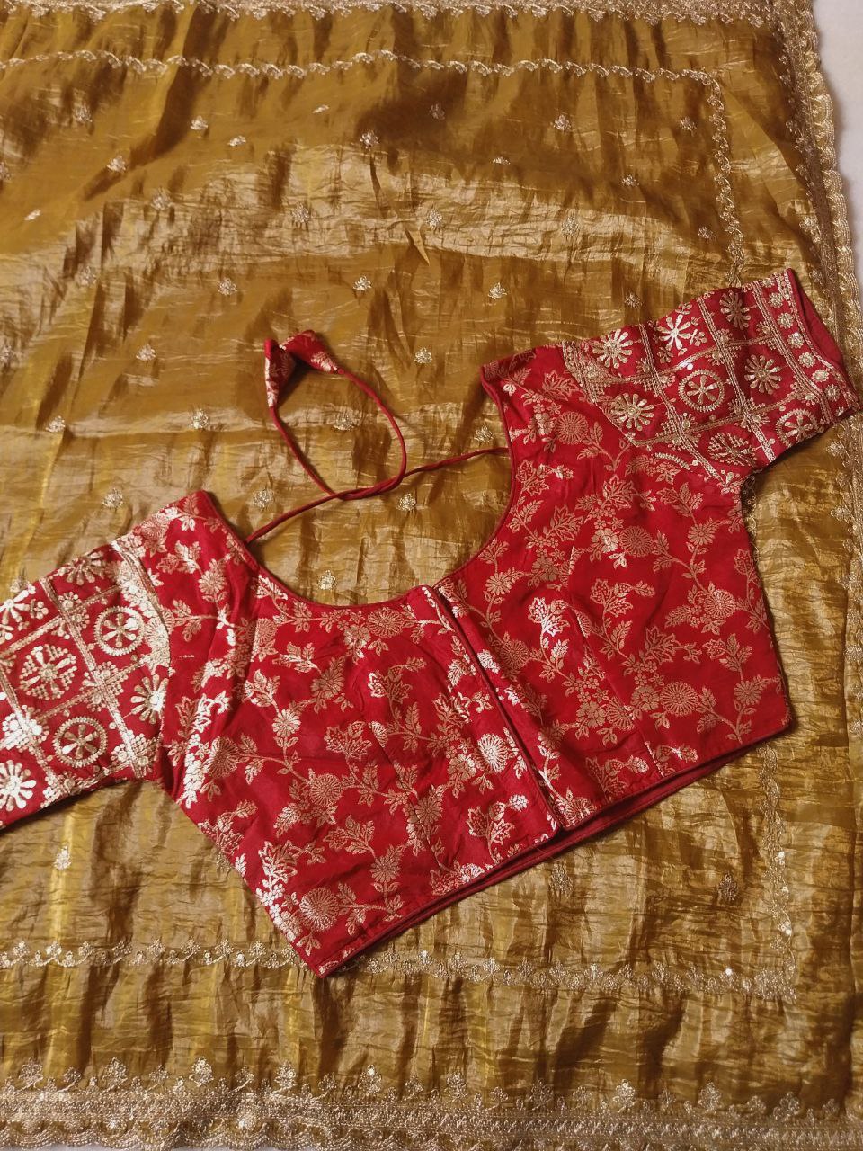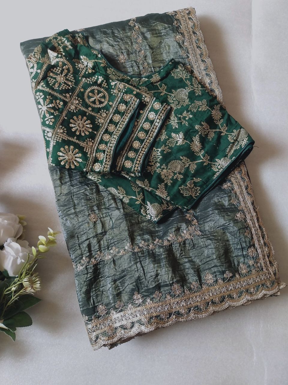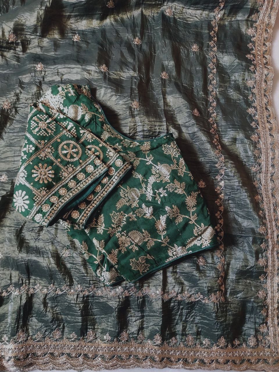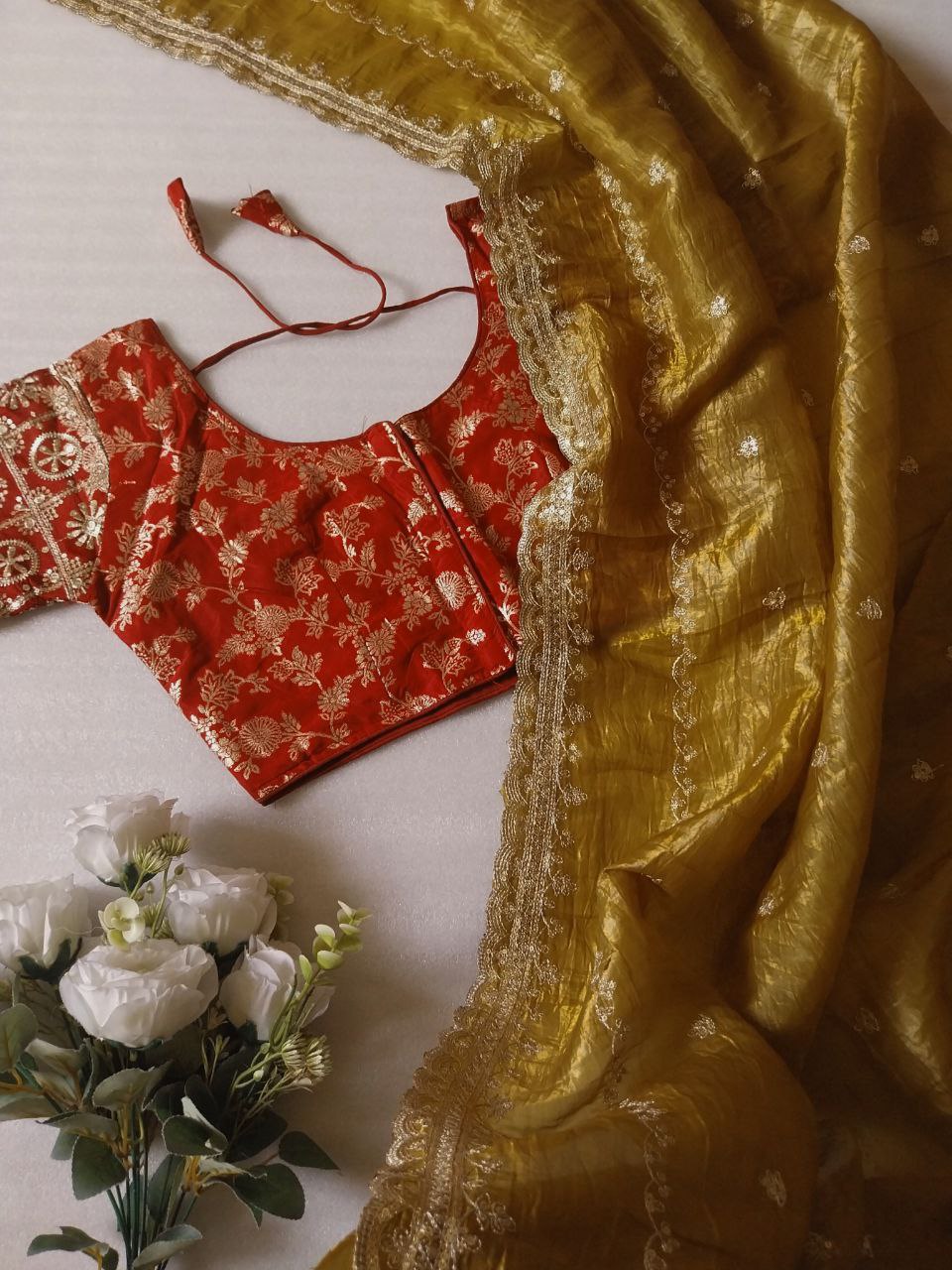 Elevate your ethnic wardrobe with this stunning Tissue Saree that's pure magic! Adorned with intricate embroidery and shimmering sequins scattered across the entire drape, this beauty features an exquisite Aarco border that steals the show. The lightweight tissue fabric ensures effortless grace and comfort, while the coordinating Jacquard Silk blouse—embellished with matching embroidery work—completes your look with sophistication. Perfect for celebrations, festivals, or whenever you want to turn heads and feel absolutely fabulous!