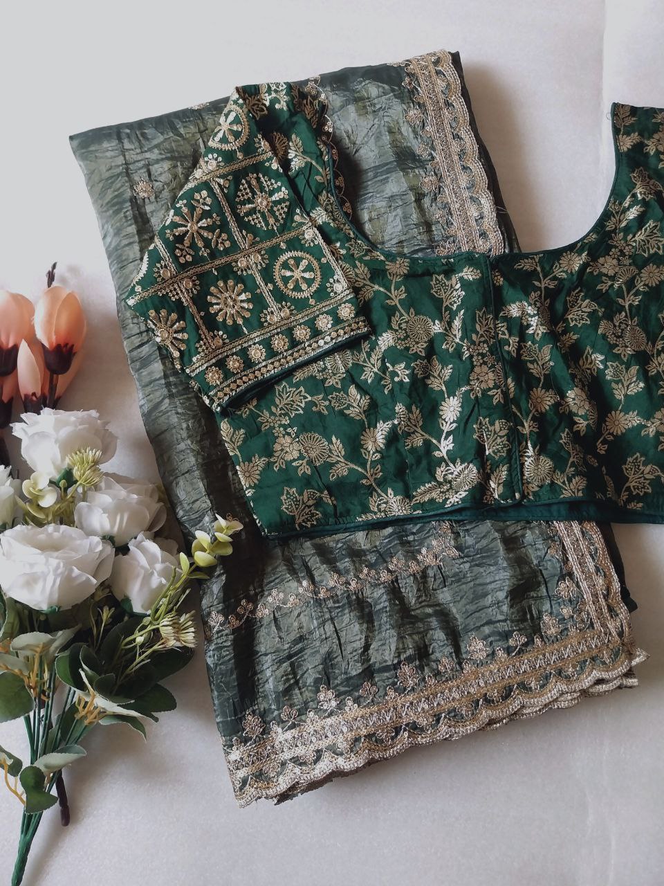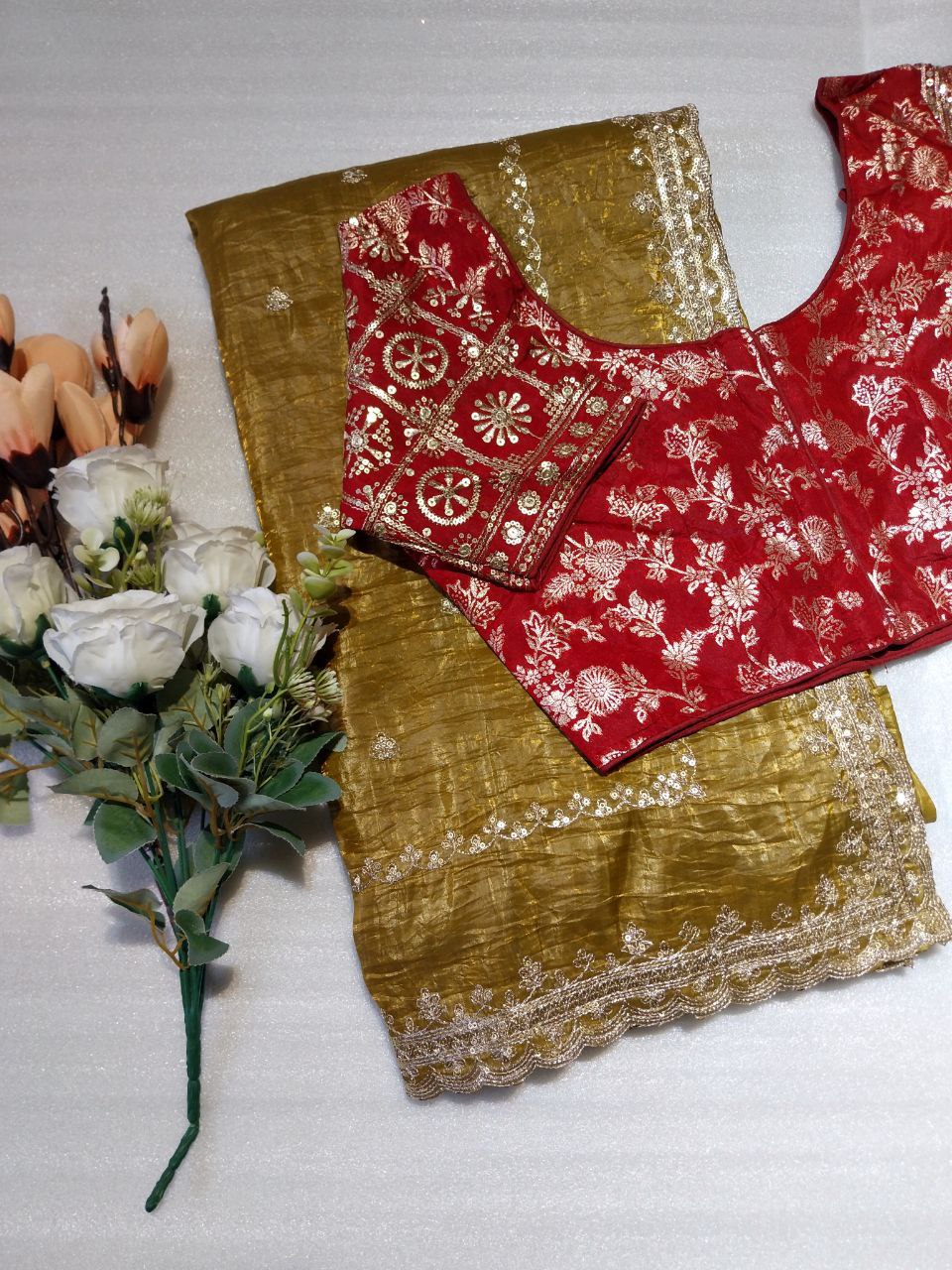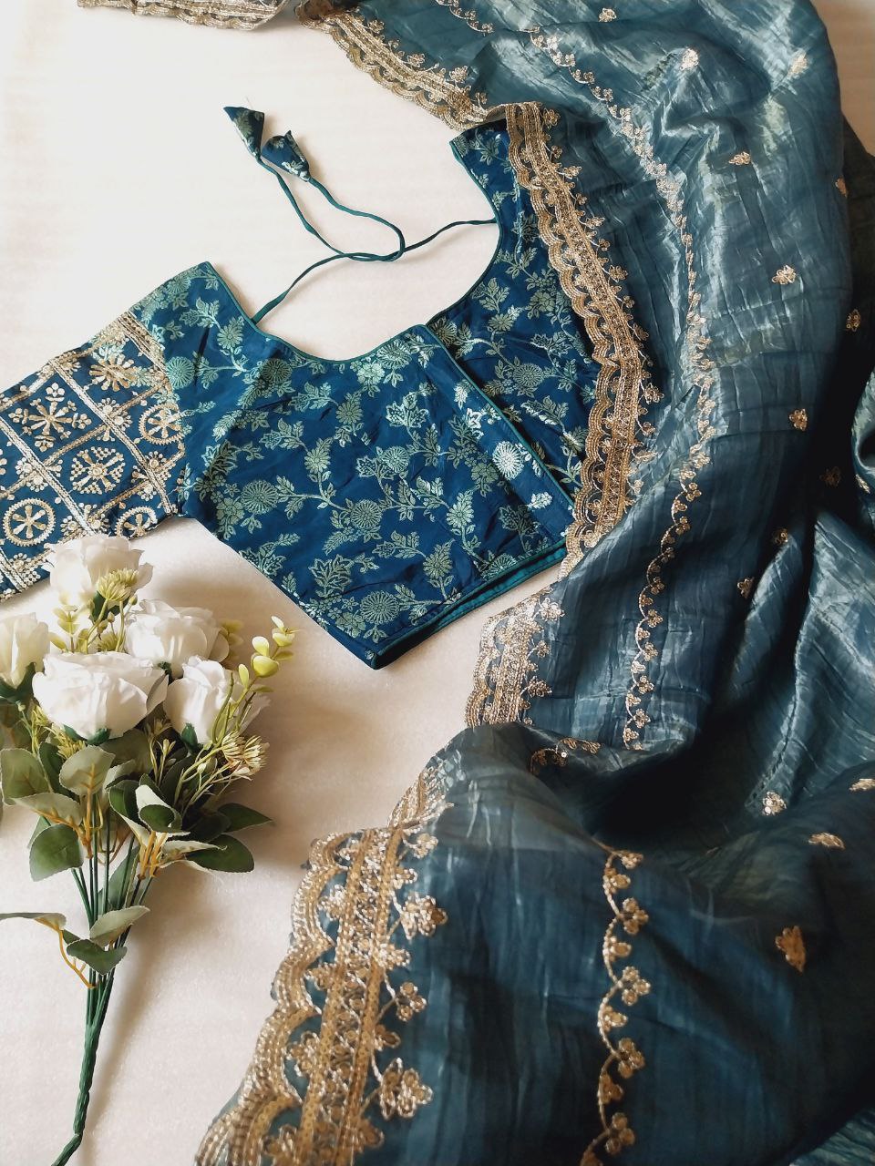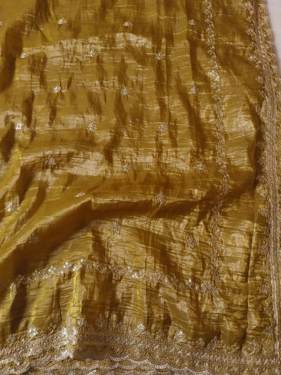 Elevate your ethnic wardrobe with this stunning Tissue Saree that's pure magic! Adorned with intricate embroidery and shimmering sequins scattered across the entire drape, this beauty features an exquisite Aarco border that steals the show. The lightweight tissue fabric ensures effortless grace and comfort, while the coordinating Jacquard Silk blouse—embellished with matching embroidery work—completes your look with sophistication. Perfect for celebrations, festivals, or whenever you want to turn heads and feel absolutely fabulous!