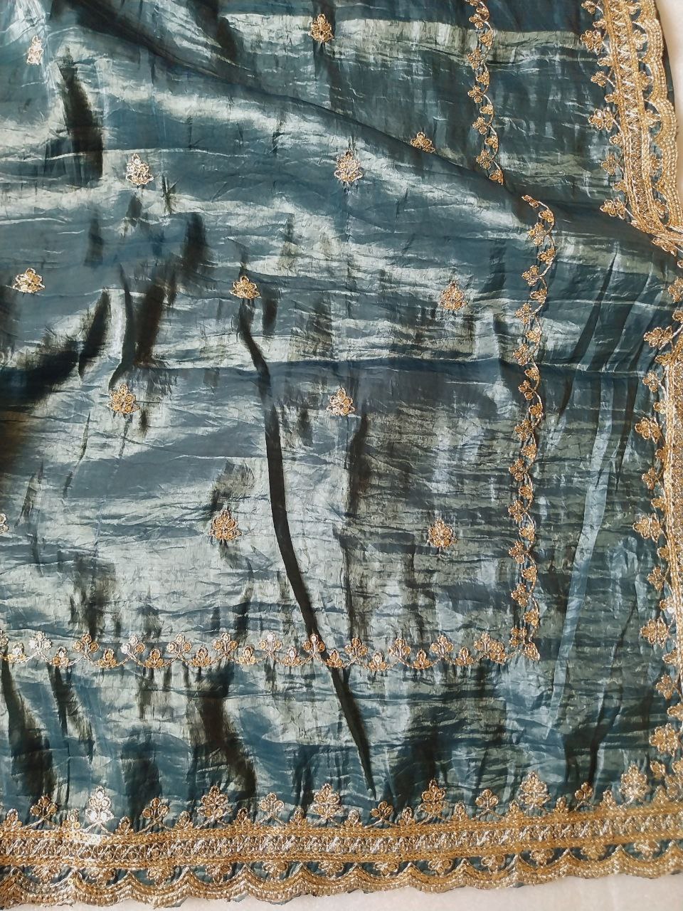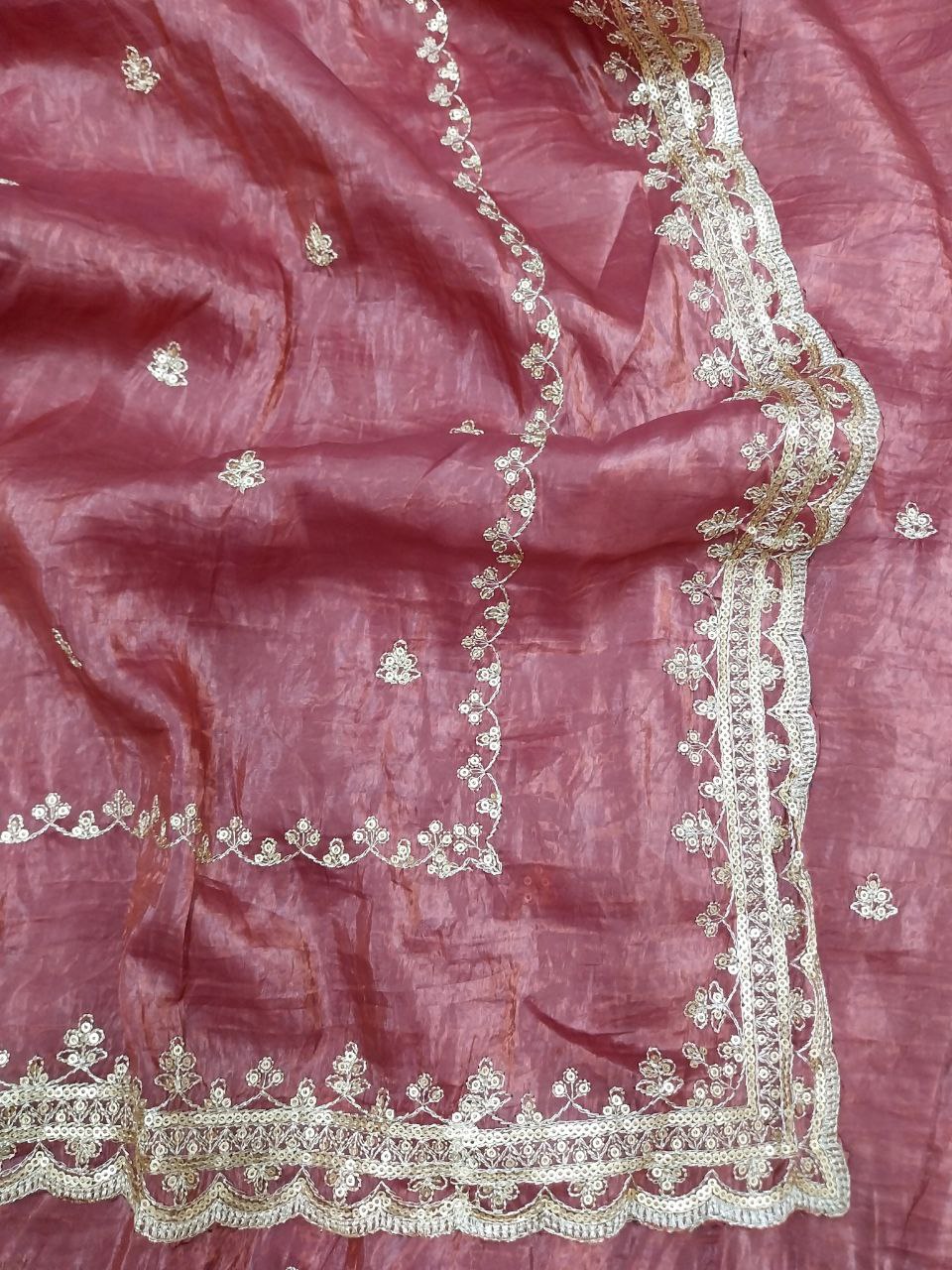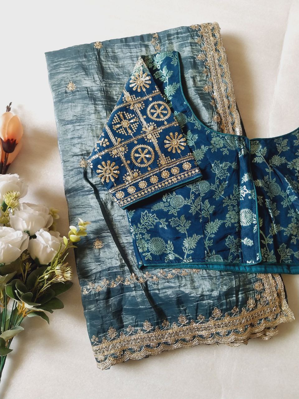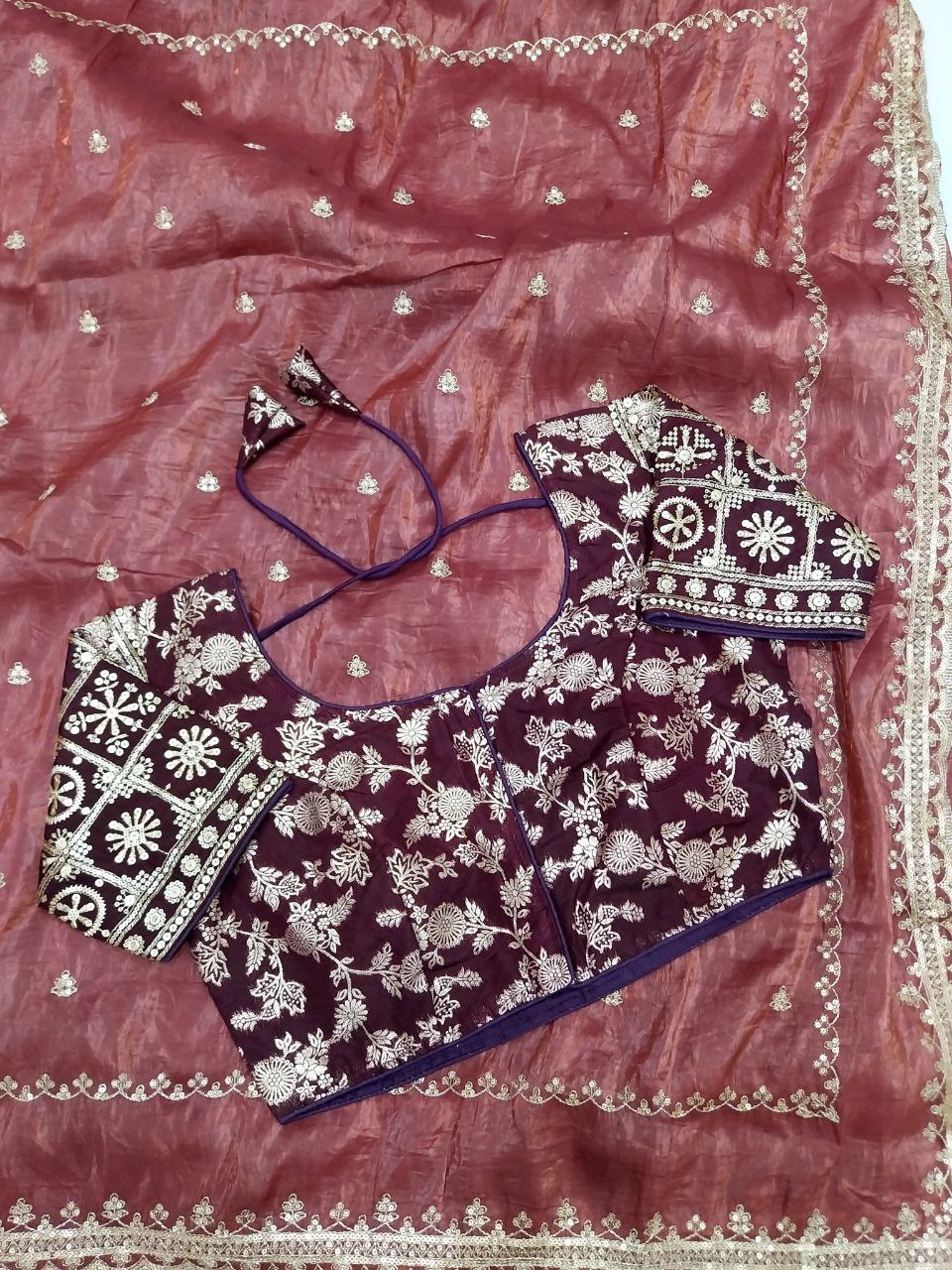 Elevate your ethnic wardrobe with this stunning Tissue Saree that's pure magic! Adorned with intricate embroidery and shimmering sequins scattered across the entire drape, this beauty features an exquisite Aarco border that steals the show. The lightweight tissue fabric ensures effortless grace and comfort, while the coordinating Jacquard Silk blouse—embellished with matching embroidery work—completes your look with sophistication. Perfect for celebrations, festivals, or whenever you want to turn heads and feel absolutely fabulous!
